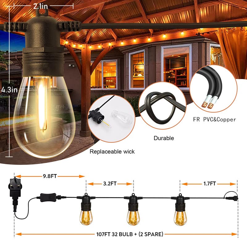107ft Festoon Lights Outdoor, 32 led Dimmable Bulbs, IP65 Waterproof Commercial Grade Outdoor String Lights for Garden, E26 Socket, 2200k