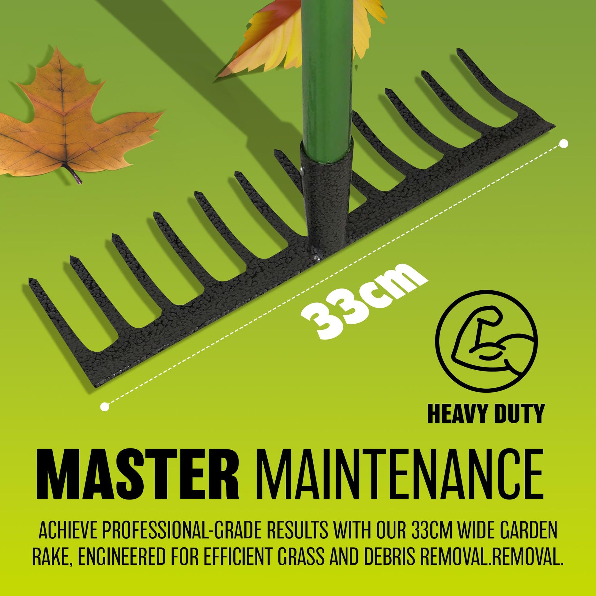 - ✔️ ABOUT THIS ITEM - 12 Tooth Rake. 1.3 Meter Length. 3cm Pole Diameter. 33cm Width. Carbon Steel Construction. This rake has 12 teeth with a metal handle and plastic finger grip to help with effective and efficient gardening.