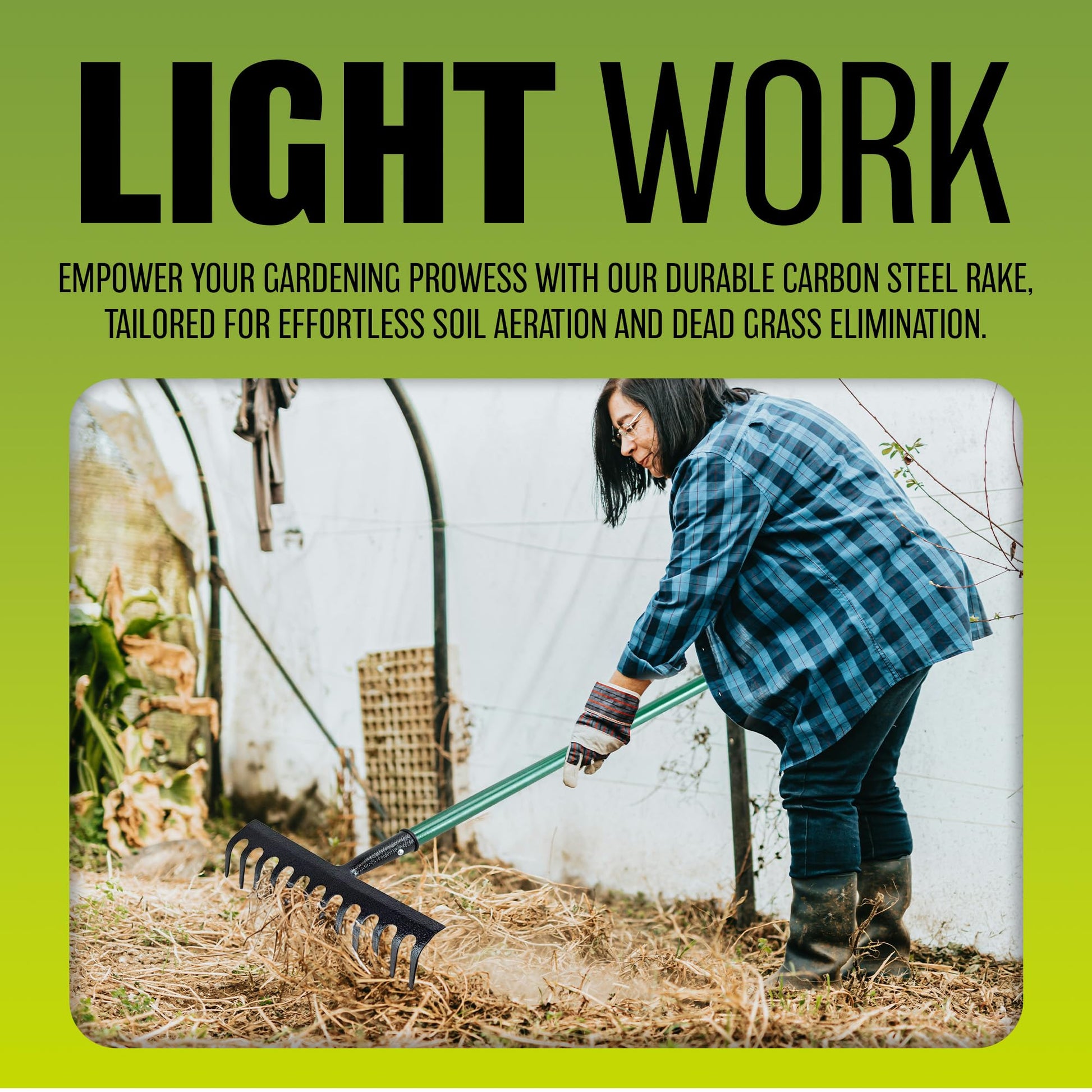 - ✔️ QUICK & EASY TO USE - Crafted from high-quality carbon steel, this rake provides the strength needed for demanding gardening activities. The sturdy build allows for efficient soil preparation, leaf collection, and other essential tasks.