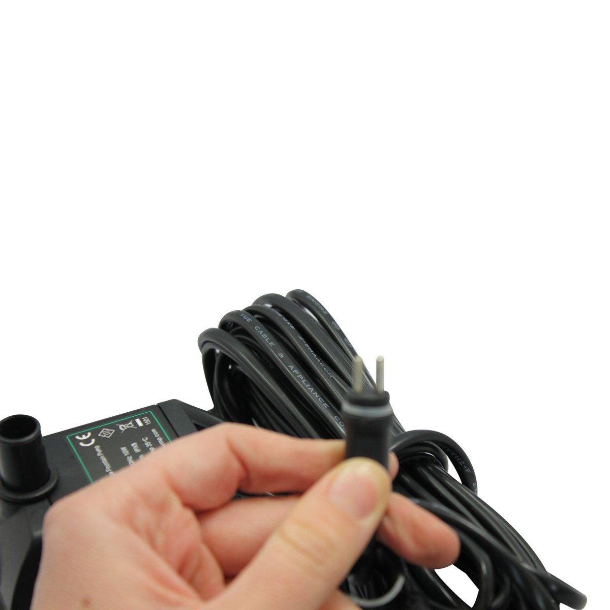 Details: Replacement mains powered pump (transformer not included) with 8m of cable and an offshoot for lights.