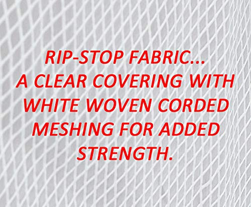 - RIP-STOP FABRIC...A CLEAR COVERING WITH WHITE WOVEN CORDED MESHING FOR ADDED STRENGTH.