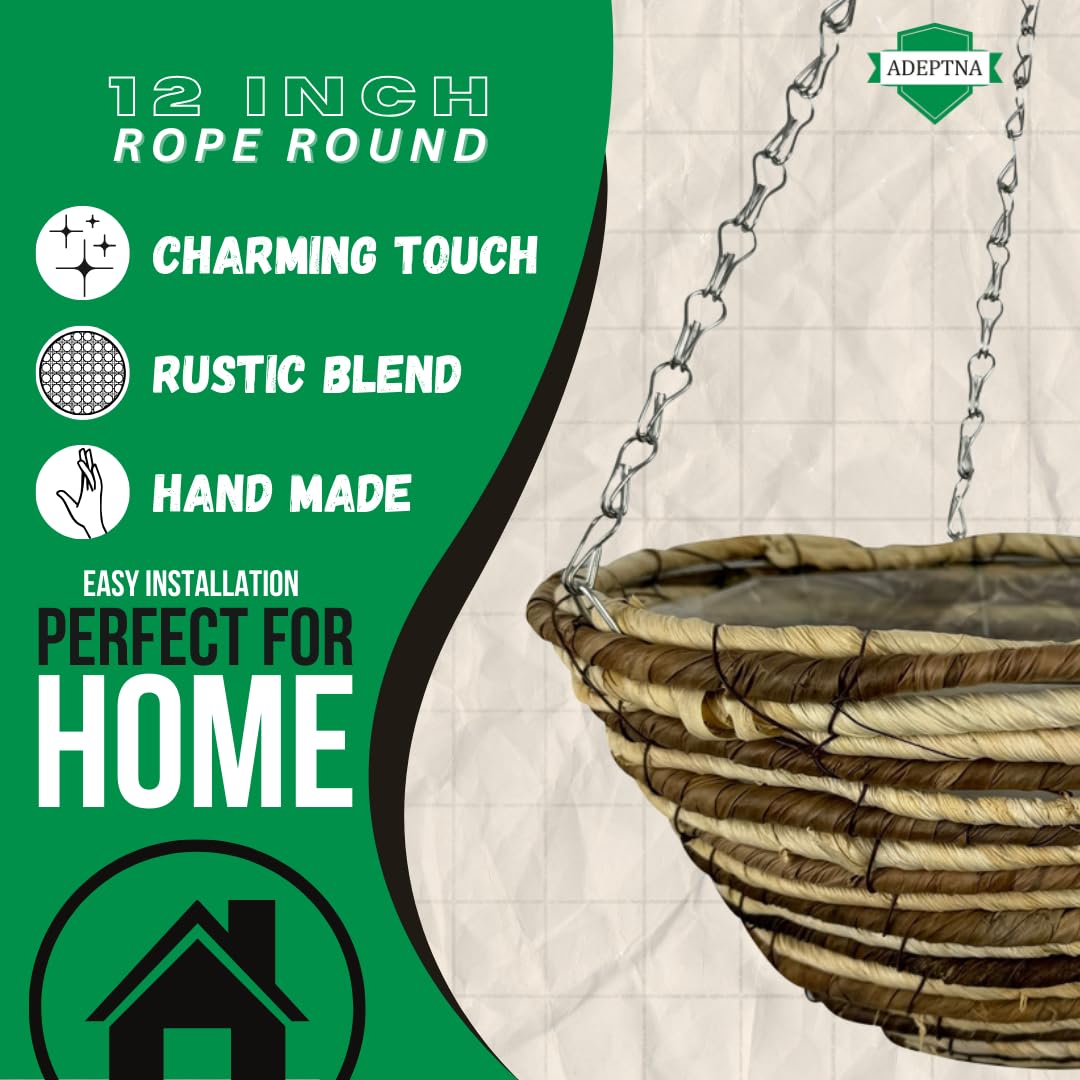 ADEPTNA Set of 2 Round Garden Hanging Baskets with Lined and Detachable Hanging Chain - Natural Basket Hanging Plants Flower Planter Pot (12ββ WICKER ROPE BASKETS)