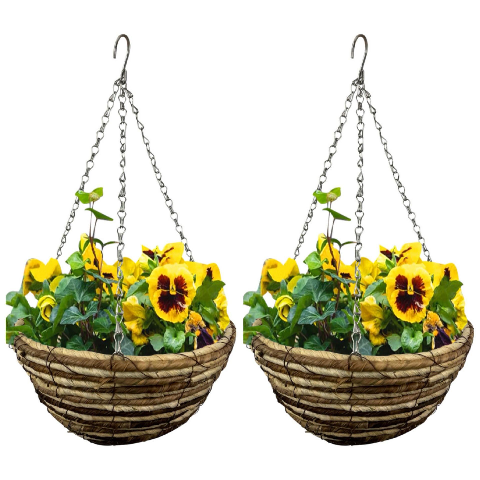 - πππππππππ OF 12ββ ROPE - Our Pack of 2 round Rope hanging baskets measures approx. 12" each basket and 20in (50cm) hanging chain. Each high-quality flower pot has a layer of plastic liner inside to prevent the leaking of water and earth. This is the perfect size to make a garden basket suitable for garden, indoor, balcony and outdoor.