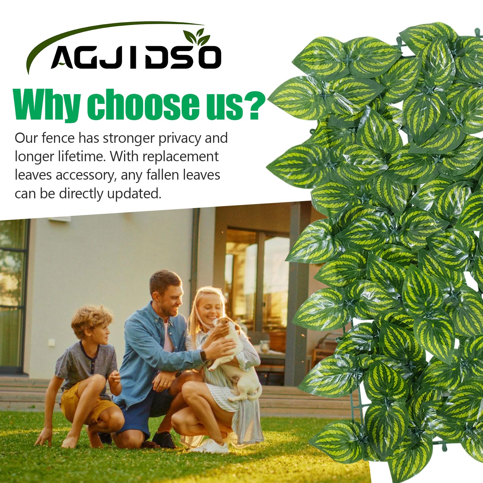 - Safe and Durable: AGJIDSO artificial ivy fence is durable and safe to use. Never fade even in harsh outdoor environments. Each artificial hedge leaf is made of high quality material, non-toxic and tasteless, protect the health of you and your family.