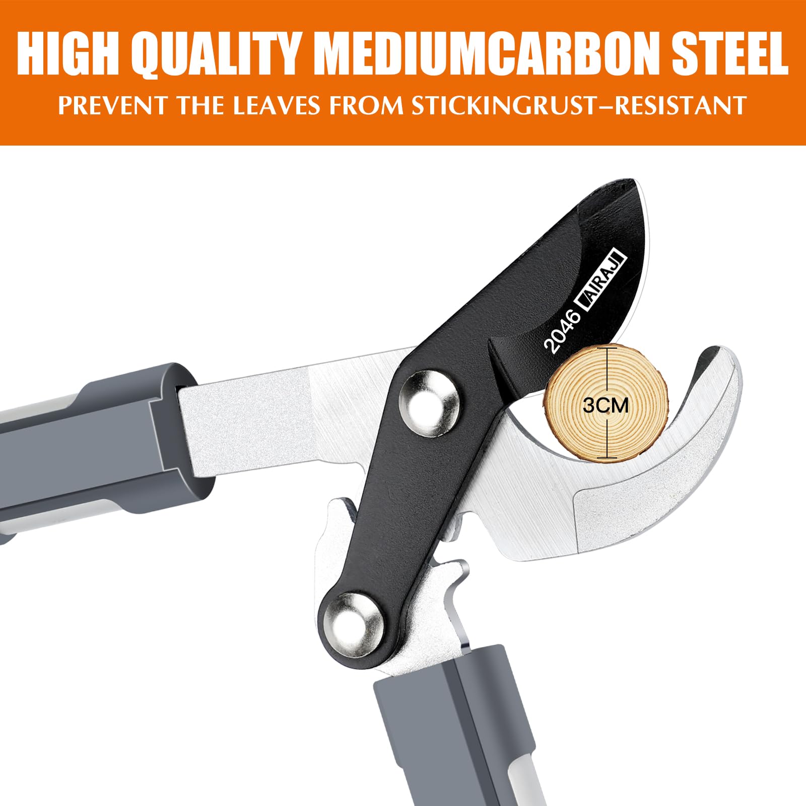 - 【High Quality Blade】AIRAJ Loppers is made of SK5 steel blade, which is strong and sharp to ensure that it can cut the branches quickly without curling the edge,and cut fast,the blade is coated with Teflon non-stick coating,this layer ensures that the blade is not easy to rust, waterproof and anti-staining and it does not injure the branches in the process of cutting.