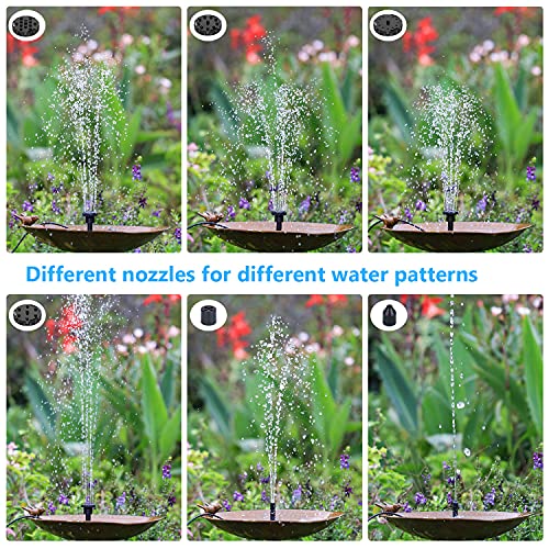 - 【6 Different Water Flow Styles】:This solar fountain pump kit has 6 different nozzles, which can be easily replaced to obtain different jet shapes to prevent water from splashing nearby. Pond pump can be connected to a hose to make different water features to satisfy your good idea. Solar powered water pump is a multifunctional solar water pump, very suitable for bird baths, fish tanks, small ponds and gardens.