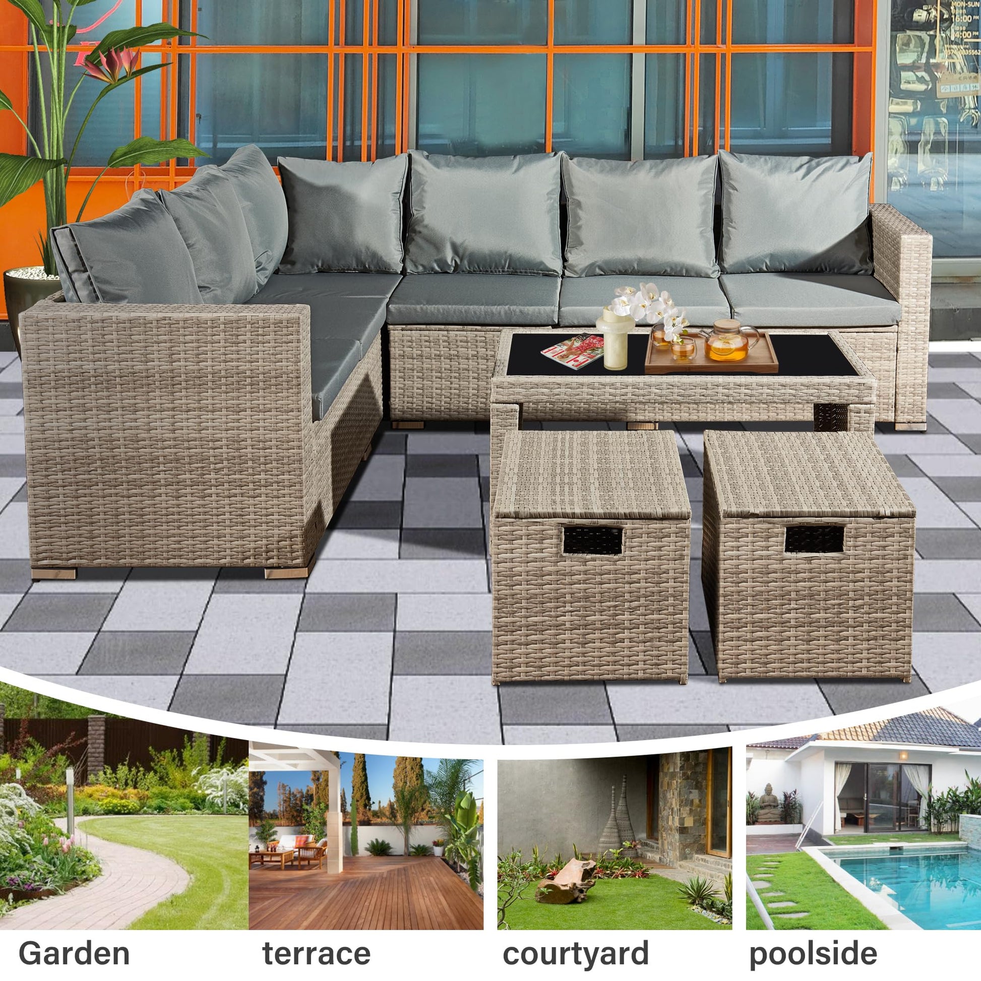 Aweather 8 Seater Rattan Corner Sofa Set Rattan Garden Furniture Set with Modern Glass Coffee Table and Washable Cushions (Gray)
