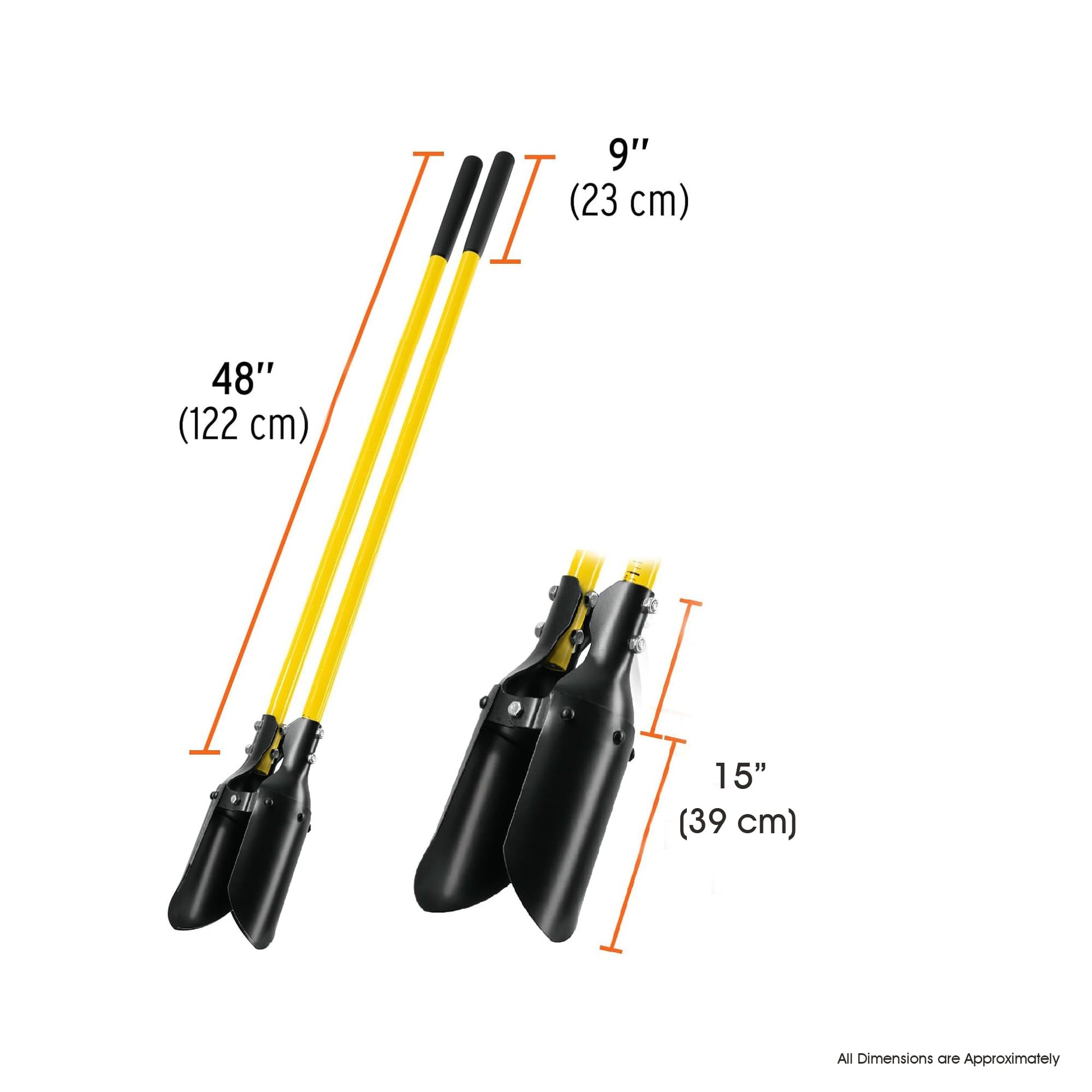 - Specifications: This tools garden hole digger is approximately 140 x 285 x 385 mm head and 1200mm handle. Auger post hole digger has hardened and tempered blades.. It has heavy duty steel shove jaws for digging through the soil, and the handles are made from a durable fiberglass material. A rubberized grip on ground auger is featured on the handles for comfort and to prevent slips. With an overall length of 58 inches, the heavy duty post hole shovel is suitable for adult use and is comfortably sized to reduce fatigue.