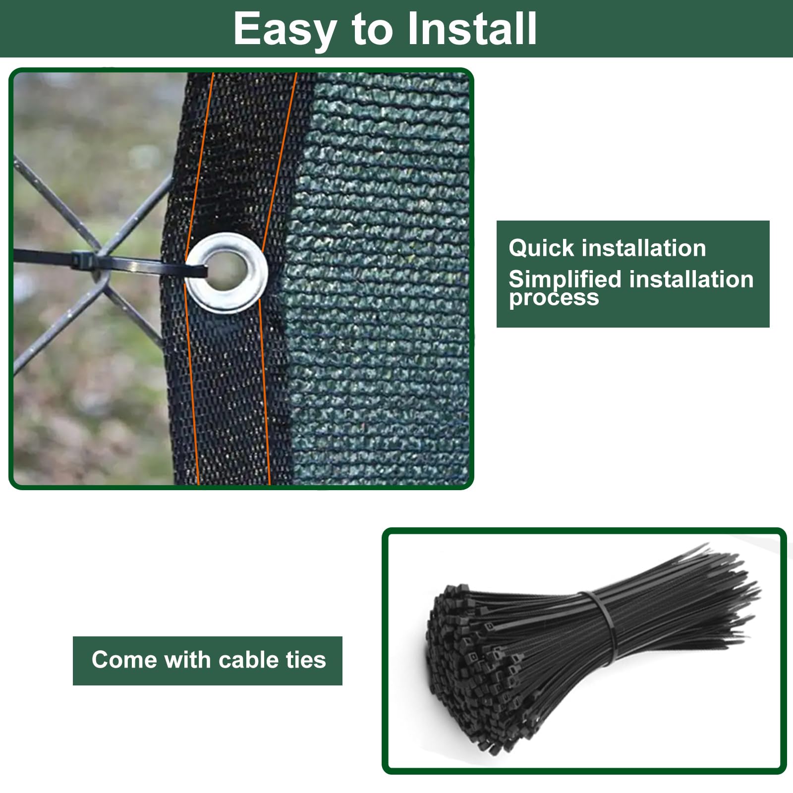 - Easy to Install Privacy Fencing: Edges are finished with heavy duty black binding and aluminum grommets, grommets are placed evenly along the edges, 1M apart on edges.Comes with Cable Ties.