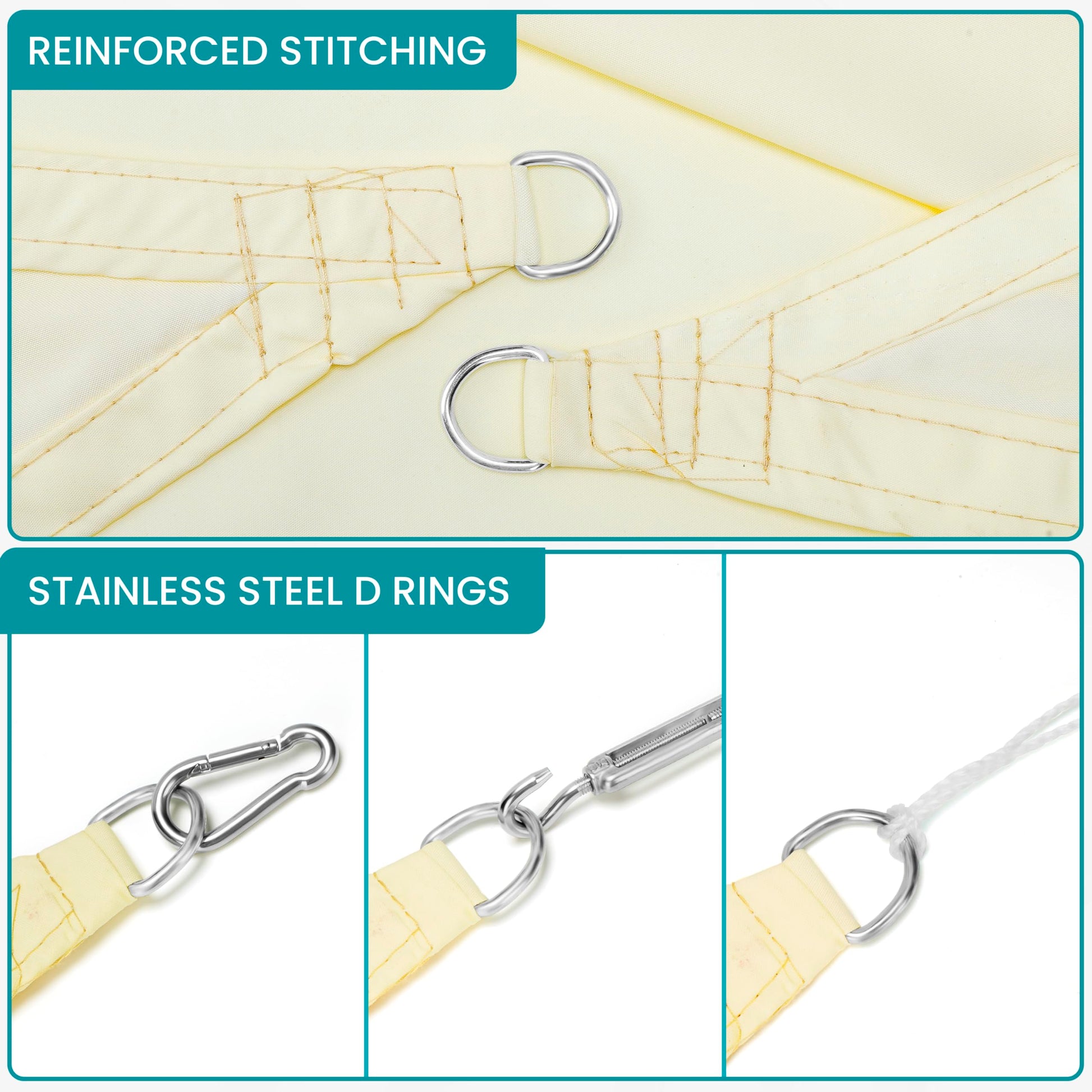- TEAR-RESISTANT FABRIC: Our shade sail is made from 170gsm polyester fabric; The material is waterproof, tear-resistant and long-lasting, with strong stitched seams; It can block both rain and sun, but should be hung at an angle to allow water to flow down