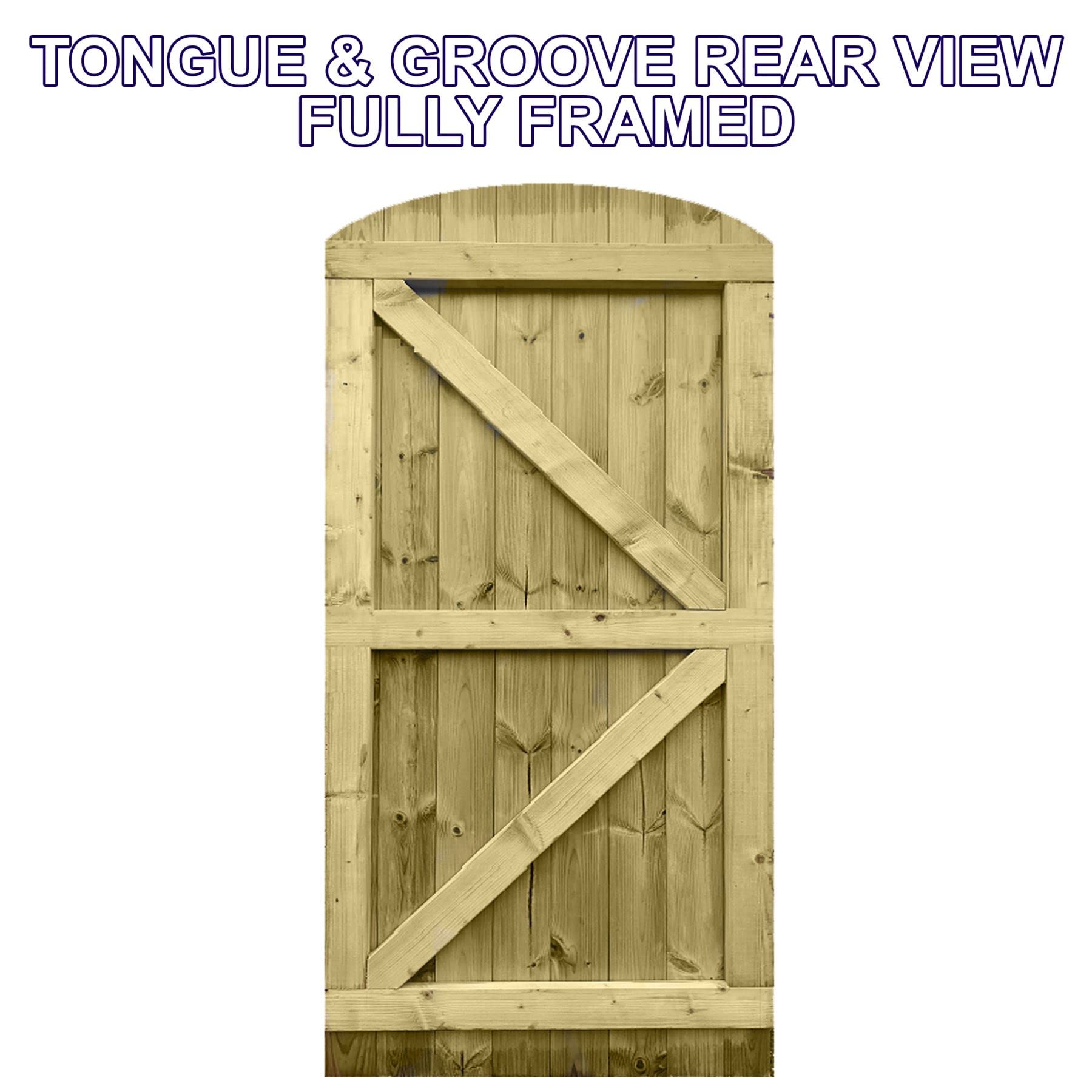 Premier Garden Supplies Made to Measure Fully Framed Tongue & Groove Arch Top gate. A fully made to measure (height & width) is a high specification arch top gate featuring interlocking tongue & groove boards mounted vertically creating a flat surface ideal for privacy and noise reduction and an approximate 20cm arch is cut out of the top. This traditional gate has a pleasing elegant appearance, the full framing on this gate makes it a robust and very strong, making it ideal for very busy pathways which remains a popular choice by all.