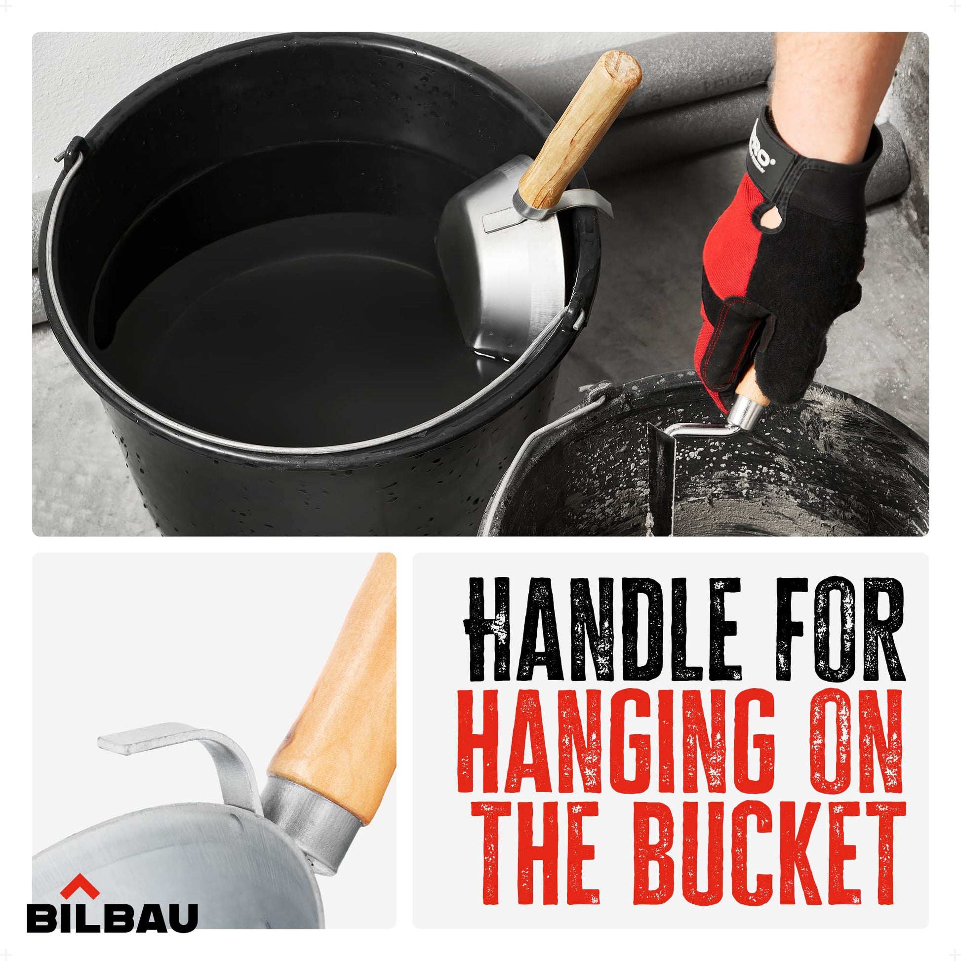 BILBAU Masonry Bucket Scoop or Dipper Bucket - for Plastering & Walling, Easy Mortar Application, Sturdy Steel, Wooden Handle, Highly Durable & Wear Resistant