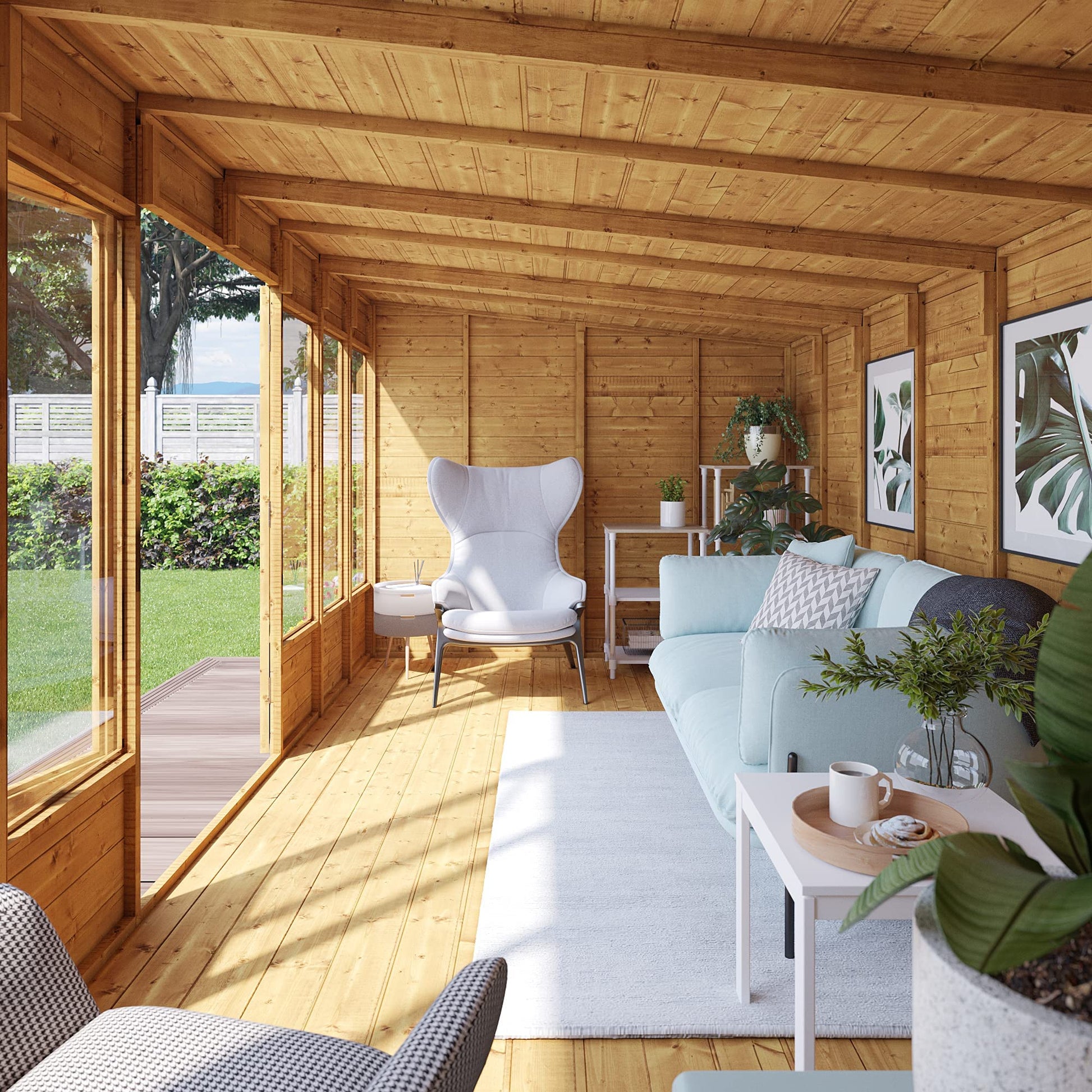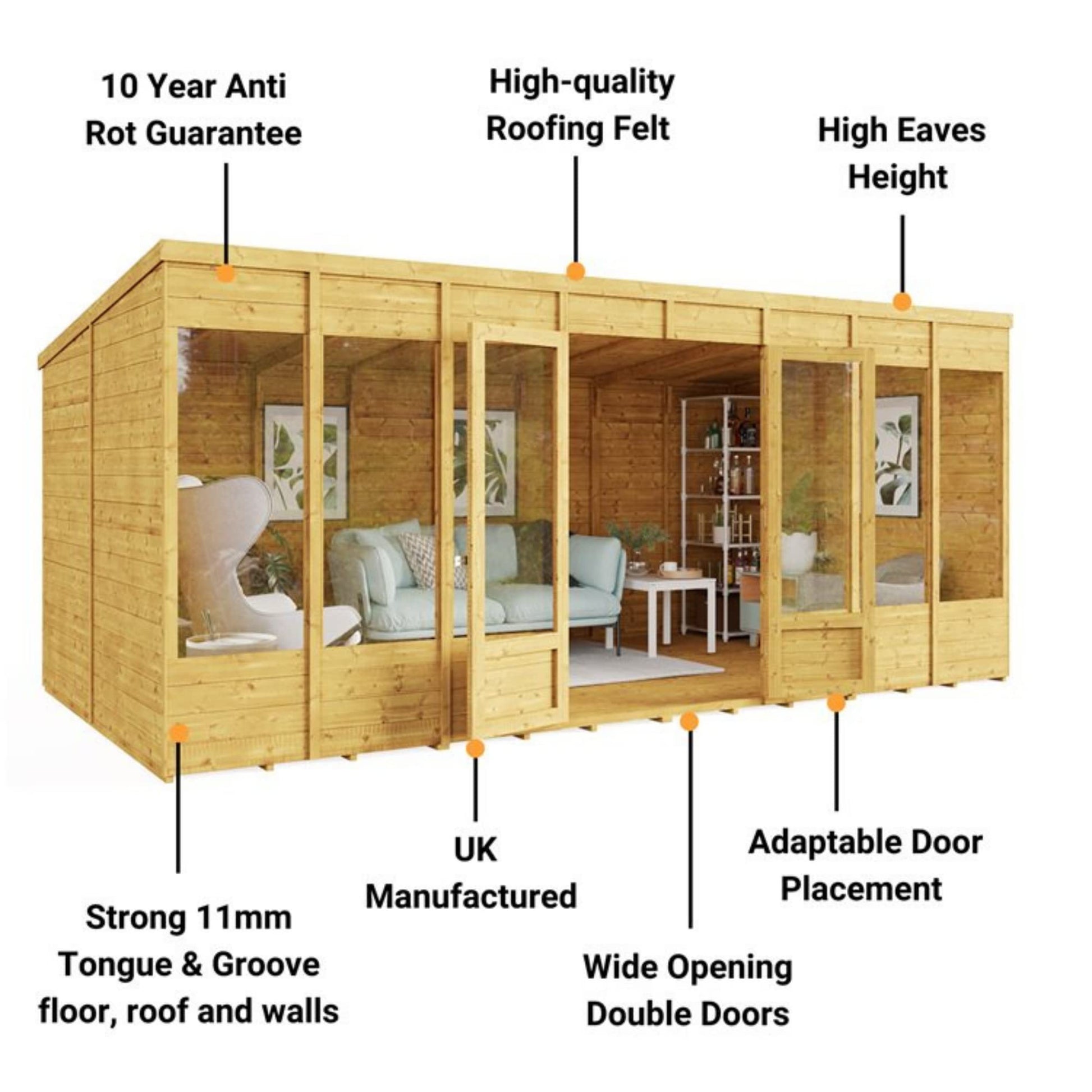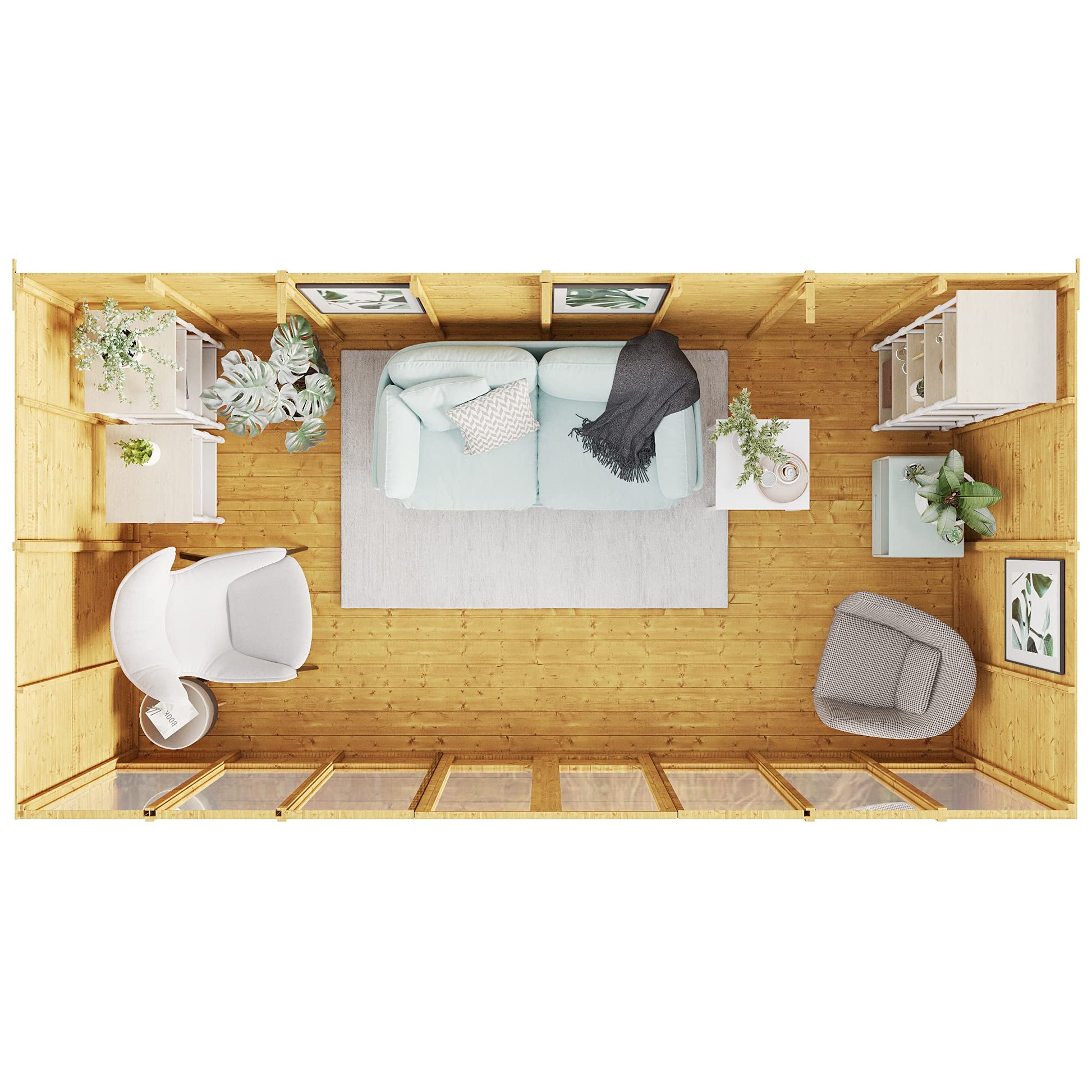BillyOh Bella 16 x 8 Summer House Shed, Modern Pent Roof Log Cabin | Spray Treated - Garden Room with Wide Double Doors, Tongue and Groove Construction | Versatile Tiny Home or Garden Office