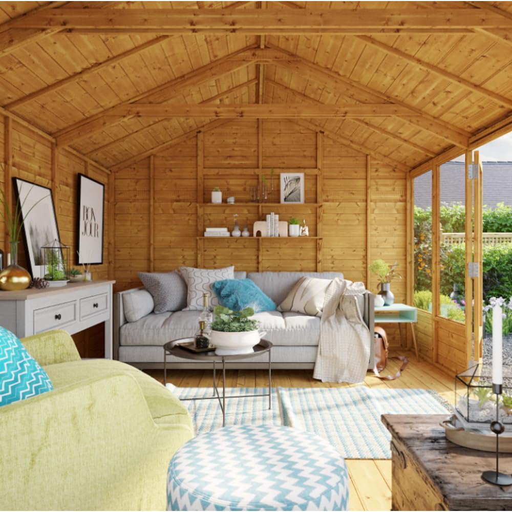 BillyOh Petra 12x10 Reverse Apex Summer House Shed, Log Cabin | Wooden Garden Room with Wide Double Doors, Tear Resistant Felt, Tongue and Groove Construction | Versatile Tiny Home or Garden Office