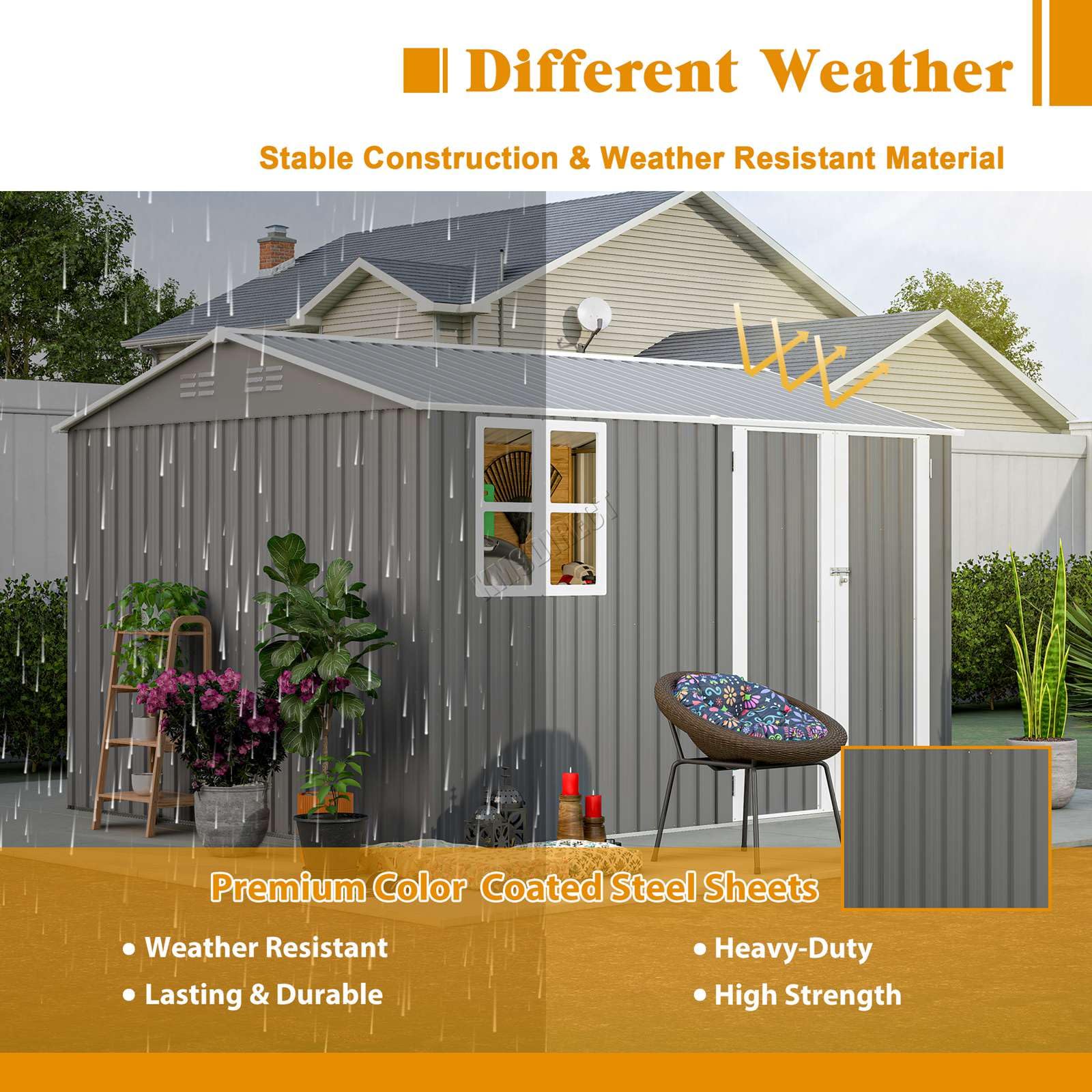 BIRCHTREE Garden Shed Steel Apex Roof House Outdoor Backyard Storage With Lockable Double Doors Window Free Foundation Tool Equipment Organizer Air Vents 10x8FT Grey