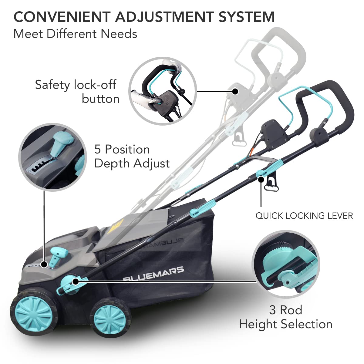 - 【Variable Working Depths】: Bluemars electric lawn rake with 5 depth positions to choose from range (-12/-9/-6/-3/-6mm), we recommend you to start scarifying at the highest depth and work your way down the depth settings for effective lawn maintenance. You can adjust the lever to a comfortable depth of raking and scarifying, which can prevent soil compaction and dispose of lawn debris easily