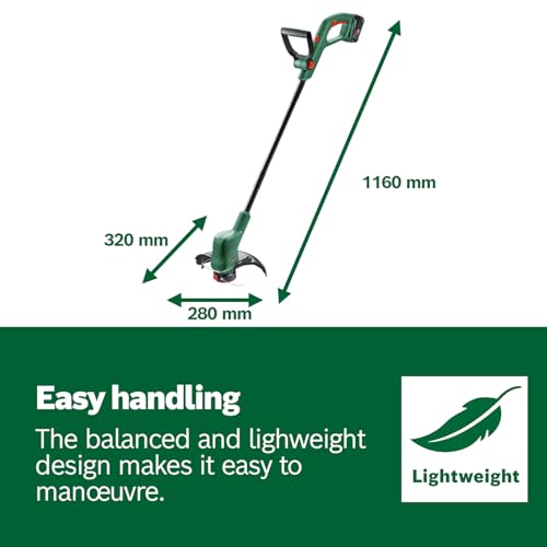 Bosch Cordless Grass Trimmer EasyGrassCut 18V-26 The Bosch EasyGrassCut 18V-26 is a lightweight and well-balanced grass trimmer. The tool features adjustable auxiliary handles which can be used for cutting at different heights. Use this lightweight grass trimmer for fine details and edges after using a regular lawnmower. The tool can be used for both trimming and edging with an easy click on the button to make the garden look very neat and tidy. Additionally, it provides continuous cutting as the system feeds the line with easy release of the trigger. Technical details: Battery Voltage: 18V Battery capacity:1.5 Ah; 2.0 Ah; 2.5 Ah; 4.0 Ah; 6.0 Ah Cutting diameter: 26 cm Weight: 1.9 kg (without battery) Scope of supply: EasyGrassCut 18V-26 Carton packaging