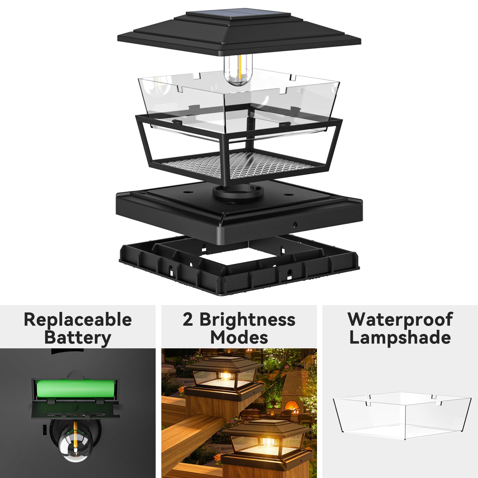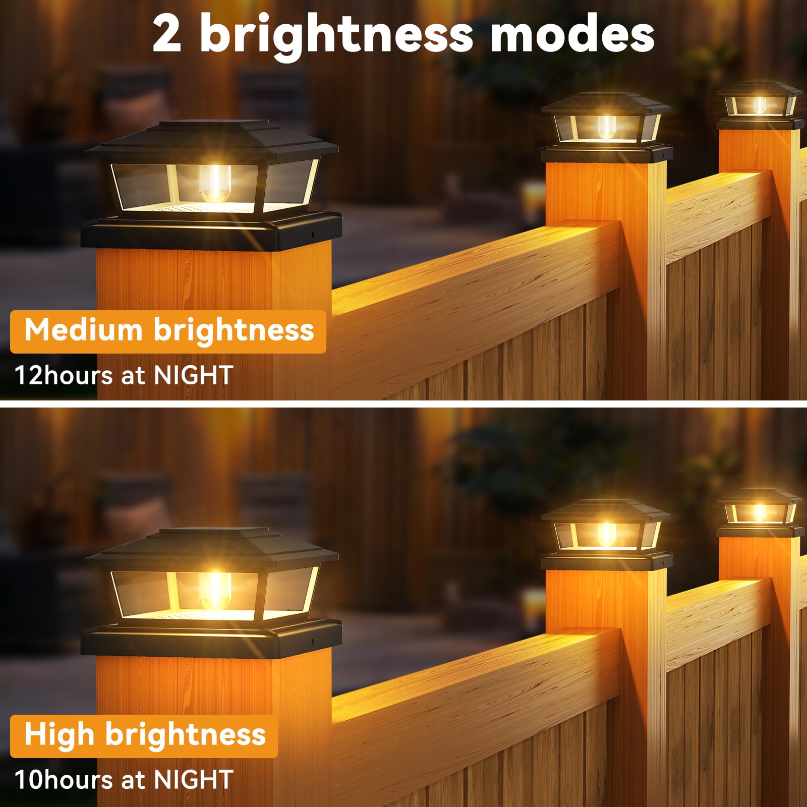 - 2 Lighting Modes: The solar post cap light has two brightness adjustment modes, you can switch at will, it brings you nearly 10-12 hours of lighting. (PS. When using it for the first time, you need to turn on the switch and select the brightness mode you need) The black solar fence light combines classic style with modern lines and a decorative transparent shell, which is coordinated with various styles of outdoor lights and garden decorations