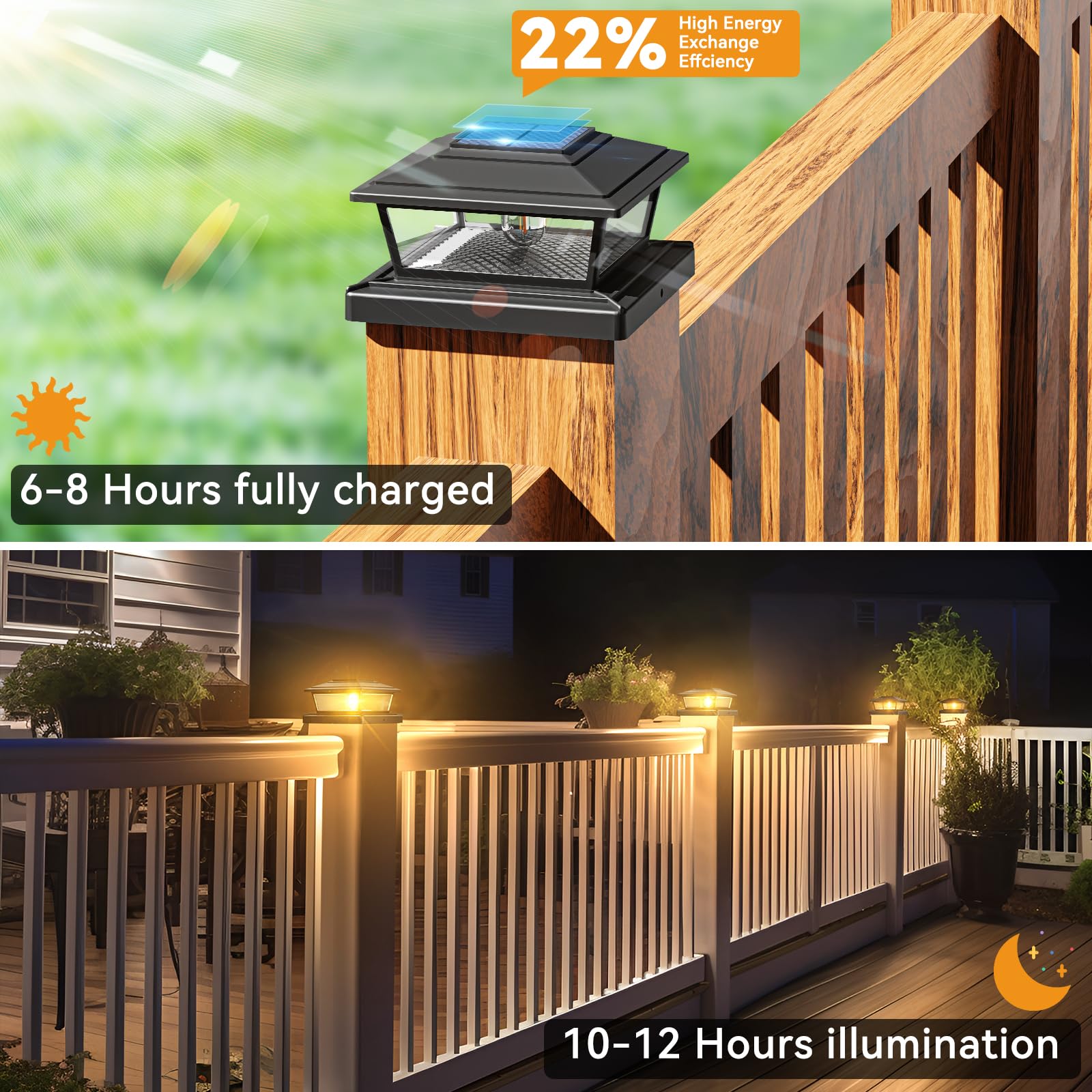- Auto On/Off - 100% Solar Powered: The decking post lights solar powered are made of high-quality vintage Edison bulbs and polycrystalline silicon solar panels, 100% powered by solar energy, automatically turns on at dusk and turns off at dawn. (NOTE: Be sure to install the solar light in direct sunlight) Intelligently protect your safety and decorate your home at the same time, saving electricity costs