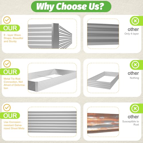 - 【Durable Galvanized Steel Construction】:Crafted with high-quality galvanized steel, this metal raised garden bed is built to last. The anti-corrosion coating ensures long-term durability, while the sturdy structure withstands heavy soil and weather conditions, making it perfect for outdoor use. Unlike traditional wooden garden beds, it resists warping and rotting over time.