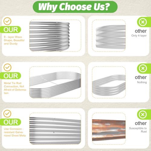 - 【Durable Galvanized Steel Construction】:Crafted with high-quality galvanized steel, this metal raised garden bed is built to last. The anti-corrosion coating ensures long-term durability, while the sturdy structure withstands heavy soil and weather conditions, making it perfect for outdoor use. Unlike traditional wooden garden beds, it resists warping and rotting over time.