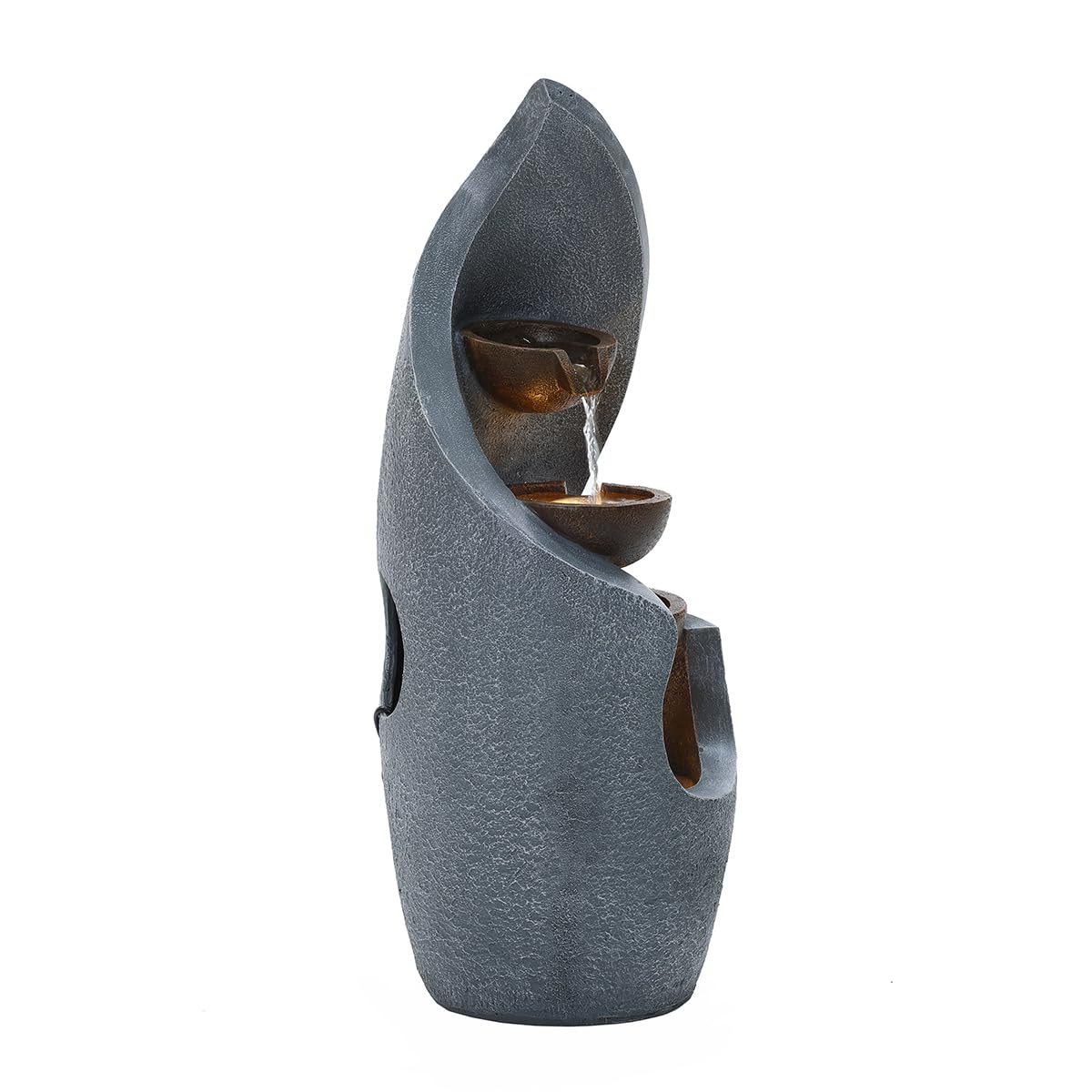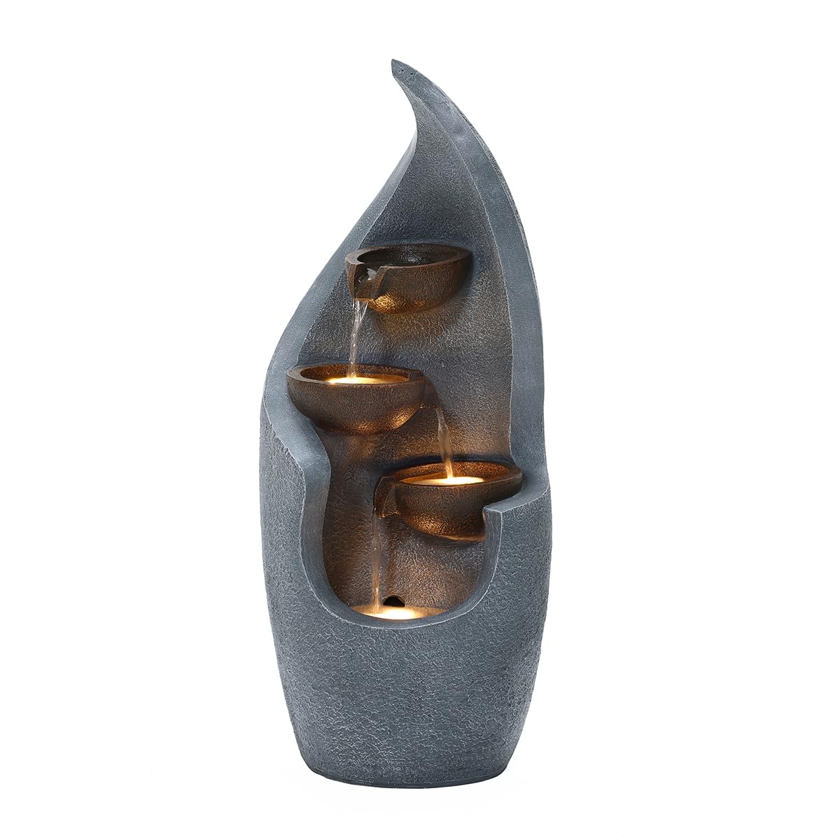 - ELEGANT 3-TIER CASCADING DESIGN: This beautifully crafted water feature boasts three cascading tiers, with elegant bronze water bowls that add a sophisticated touch to any garden, patio, or courtyard. It's eye-catching design creates a stunning focal point, featuring built-in LED lights that beautifully illuminate the water for a serene and visually stunning effect.