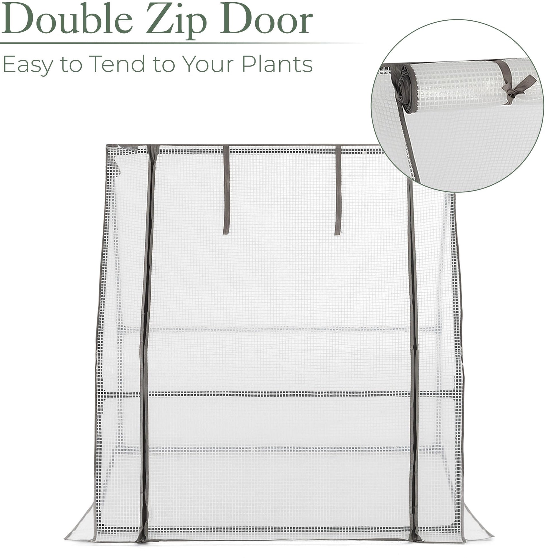 - ROLL UP ZIPPER DOOR WITH TIES: The grow tunnel greenhouse has a roll up door with zippers on each side to easily open and securely close. Fabric ties allow you to secure the door when open to easily feed and water your plants and flowers. By leaving the door tied open, you can allow air to circulate, regulate the temperature, and encourage pollination.