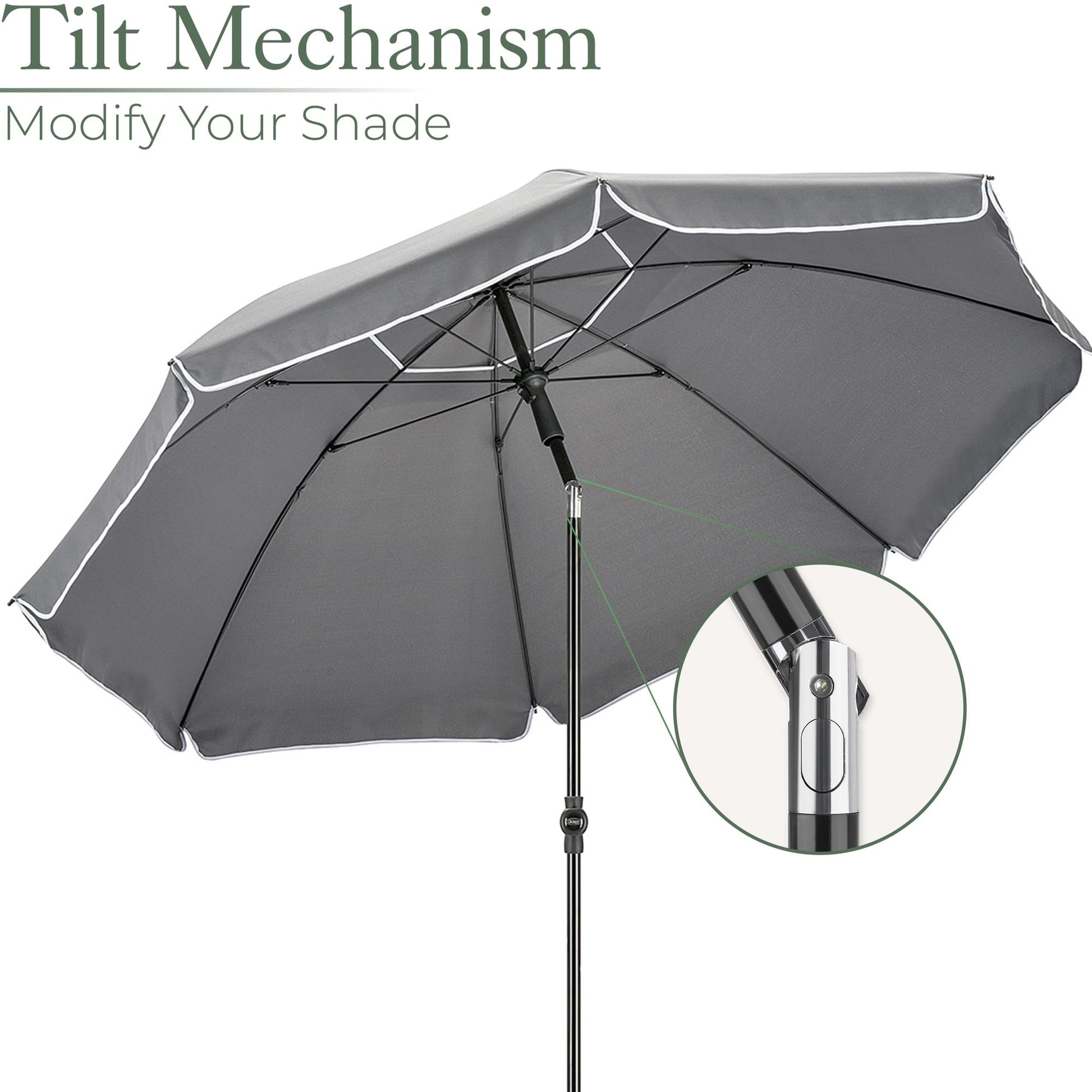 - TILTING FUNCTION TO SHADE YOU ALL DAY LONG: A push button allows you to tilt the canopy left or right to block out glare from the low-lying sun. As the sun moves throughout the day, you can easily adjust the canopy to provide all day protection. The fringed sides provide additional shade whilst giving the parasol that classic ‘beach umbrella’ look.