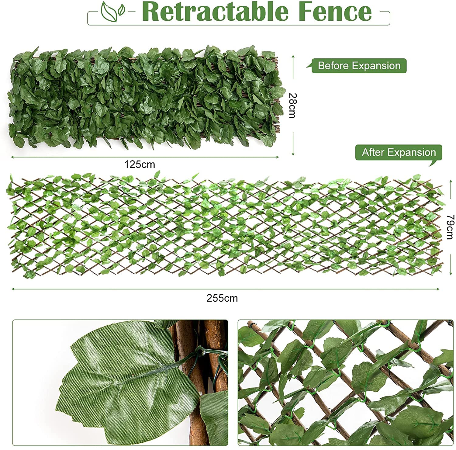 - 【Expandable Faux Leaf Fence】The expandable artificial hedge fence allows you to adjust the length according to your desired dimensions. Measurement before expansion is 125cm x 28cm, measurement after expansion is 255cm x 79cm.