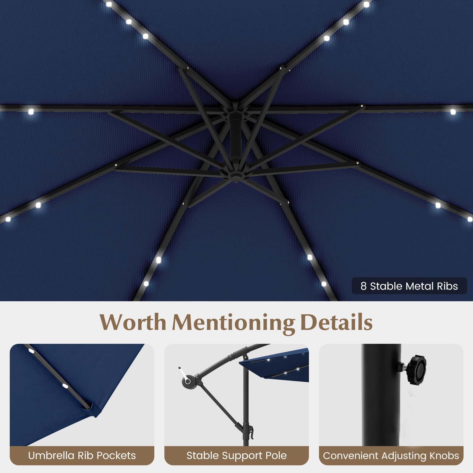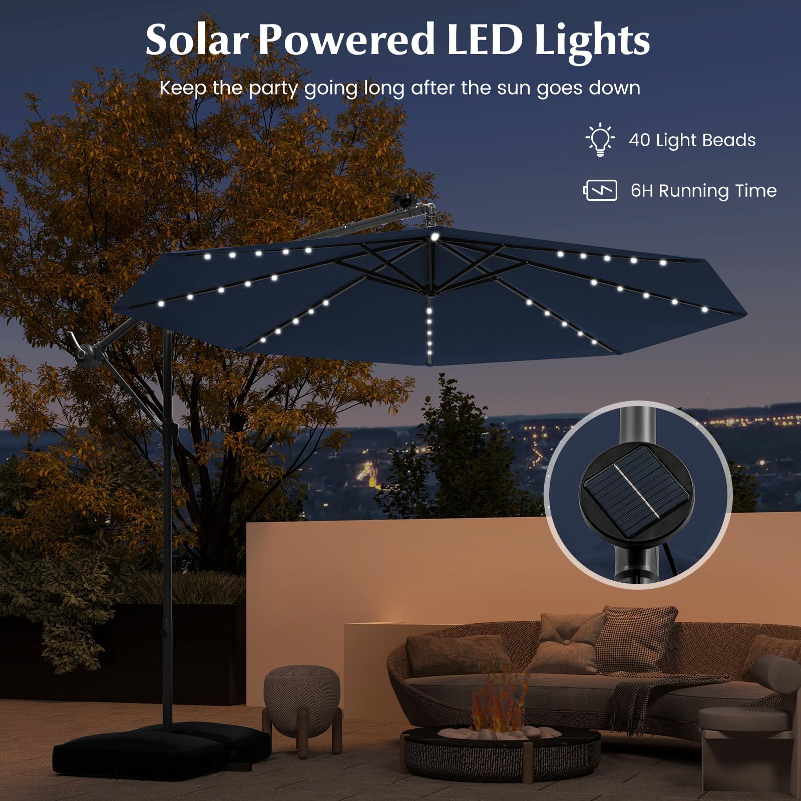 COSTWAY 3M Cantilever Garden Parasol, Hanging Offset Umbrella with 40 LED Lights, Solar Panel Batteries & Sand Bag, Outdoor Water-proof Canopy Sunshade Shelter for Patio Balcony (Navy)