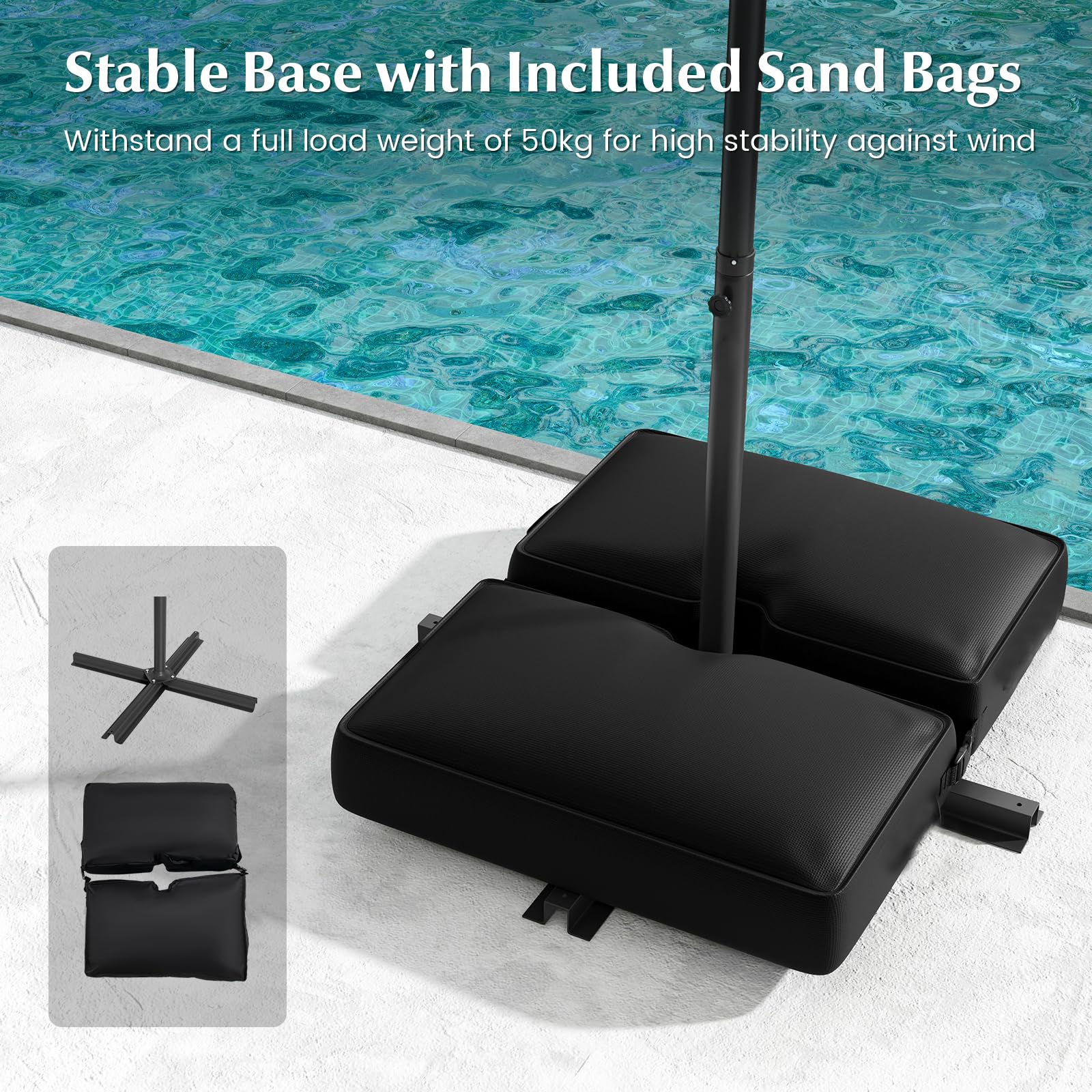 - 【Sturdy Frame & Solid Sand Bag】Constructed of plastic sprayed firm pole, which is characterized by high rust and water resistance, this sturdy and durable cantilever umbrella ensures a long service life. In addition, the umbrella comes with 2 empty sandbags(each can be filled with 50 kg sand) which ensures high stability against wind.