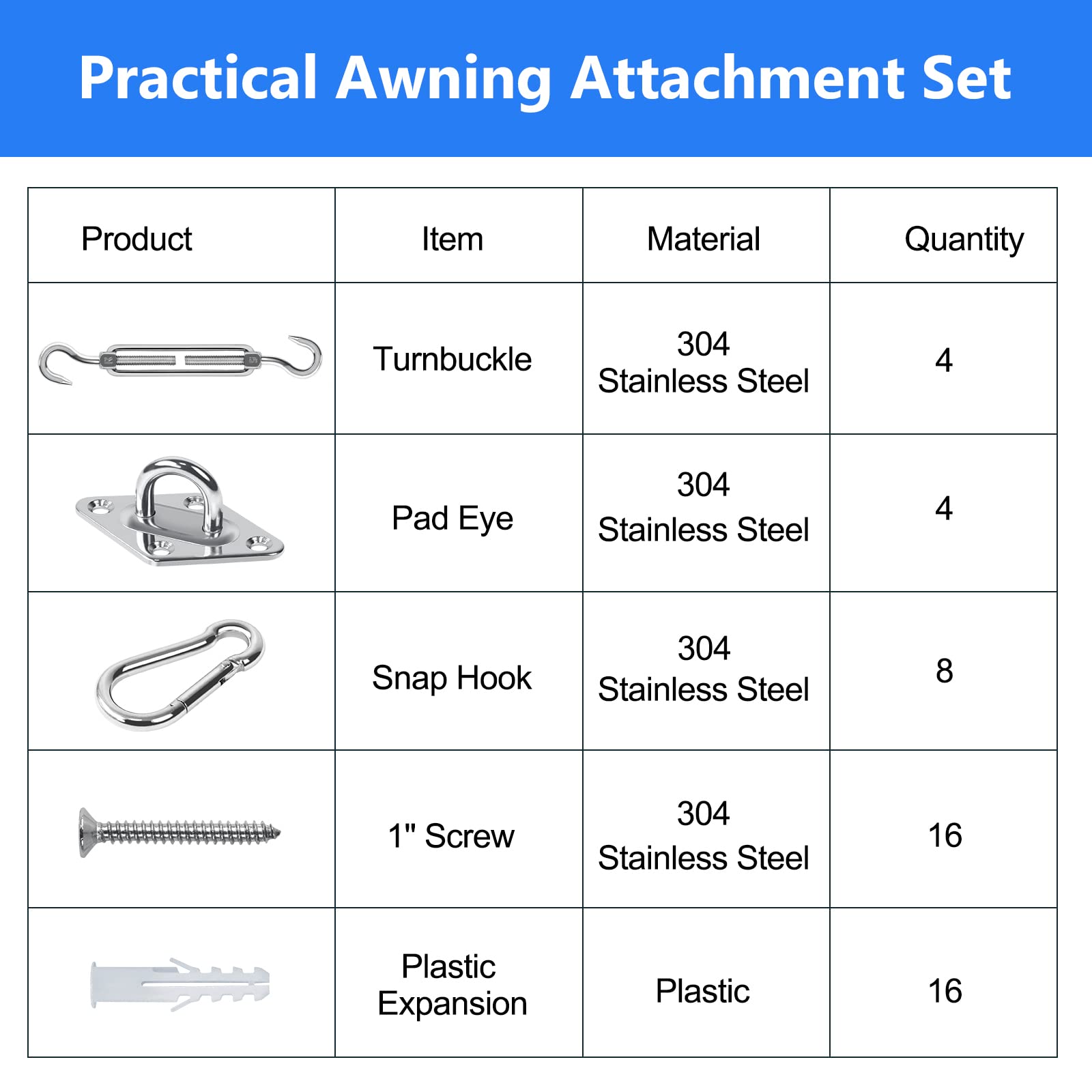 - Sun Shade Sail Installation Kit: Heavy-duty stainless steel hardware kit for sun shade installation, designed for durability and reliability, heavy-duty hardware for fixing the screen, and work for the sun shade to keep it in tension.