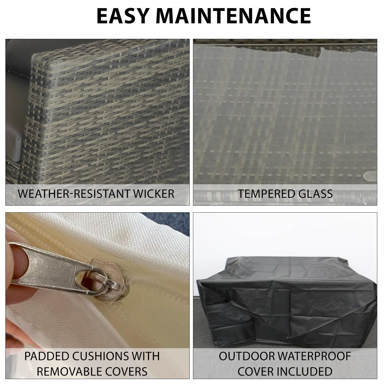 - EASY MAINTENANCE - Weather-resistant wicker, tempered glass, and padded cushions with removable covers allow for easy cleaning and maintenance. Note: It is not recommended to expose cushions to rain or snow.