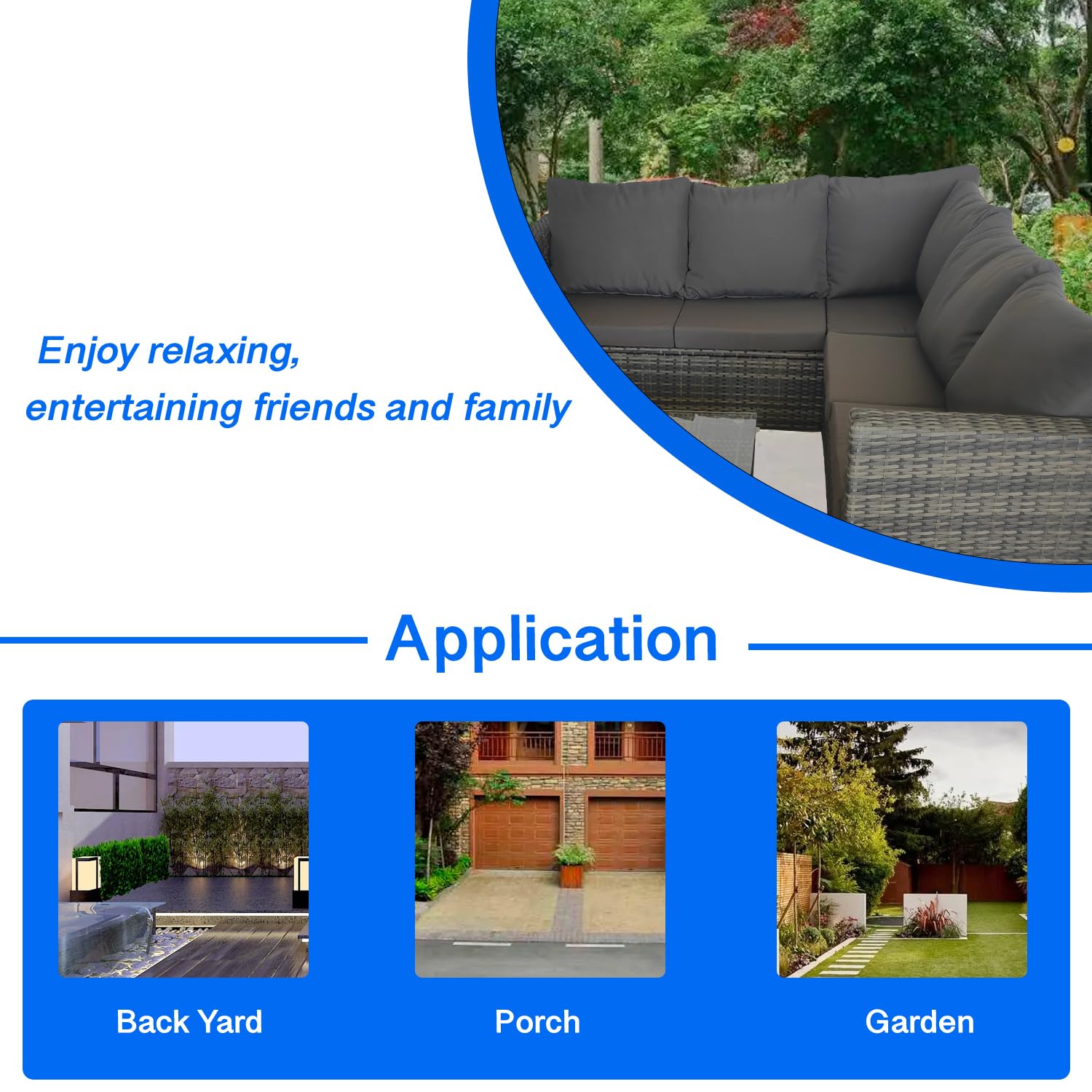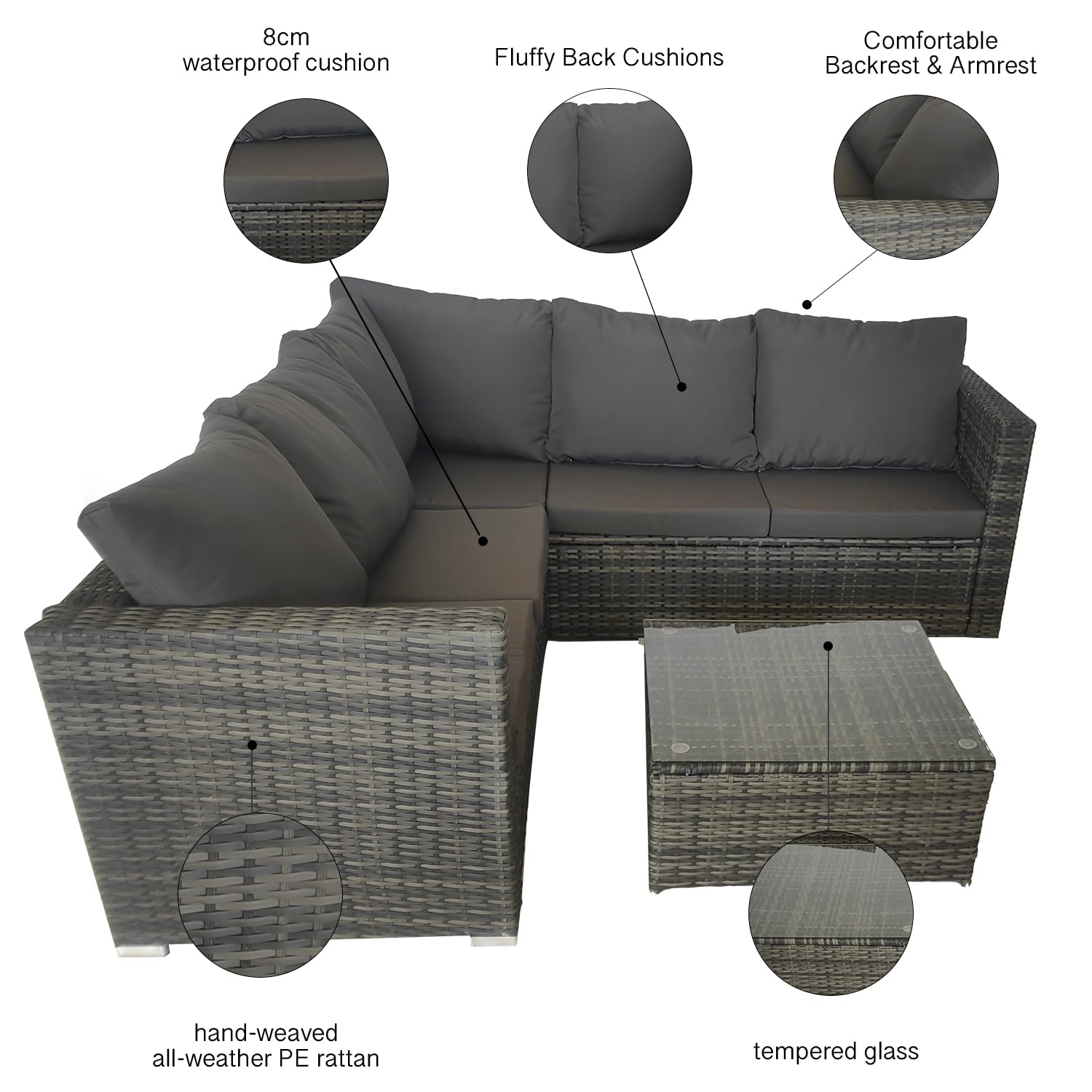 - COMFORTABLE SITTING - This 5 seater corner sofa set comes with thick lofty sponge padded water resistant cushions which makes long time sitting enjoyably. Plus with coffee table, this garden furniture set, like a real living room where comfort comes first, offers an oasis of comfort to you, your family, and guests