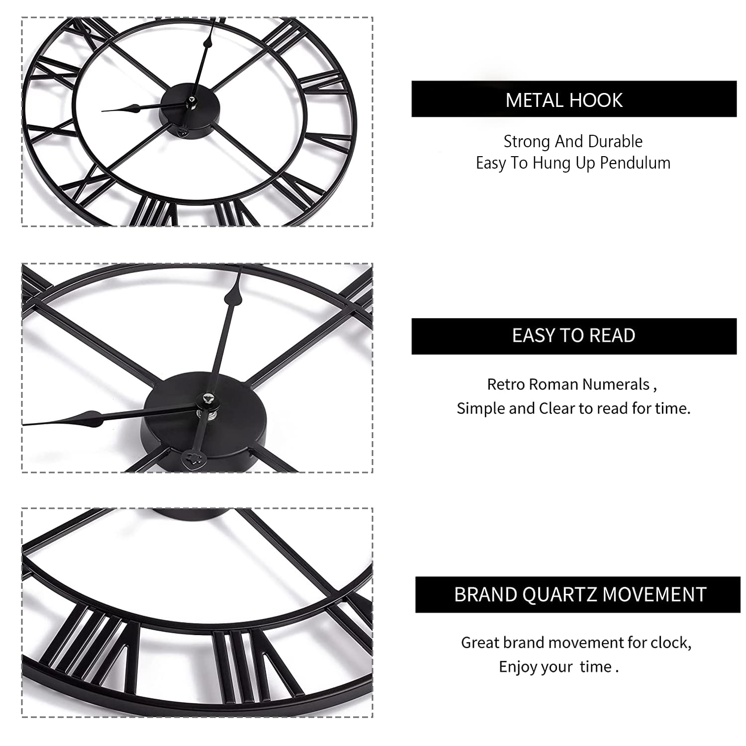 Crystals Open Face Large Outdoor Garden Wall Clock, Giant Big Roman Numerals - 60CM (Black)