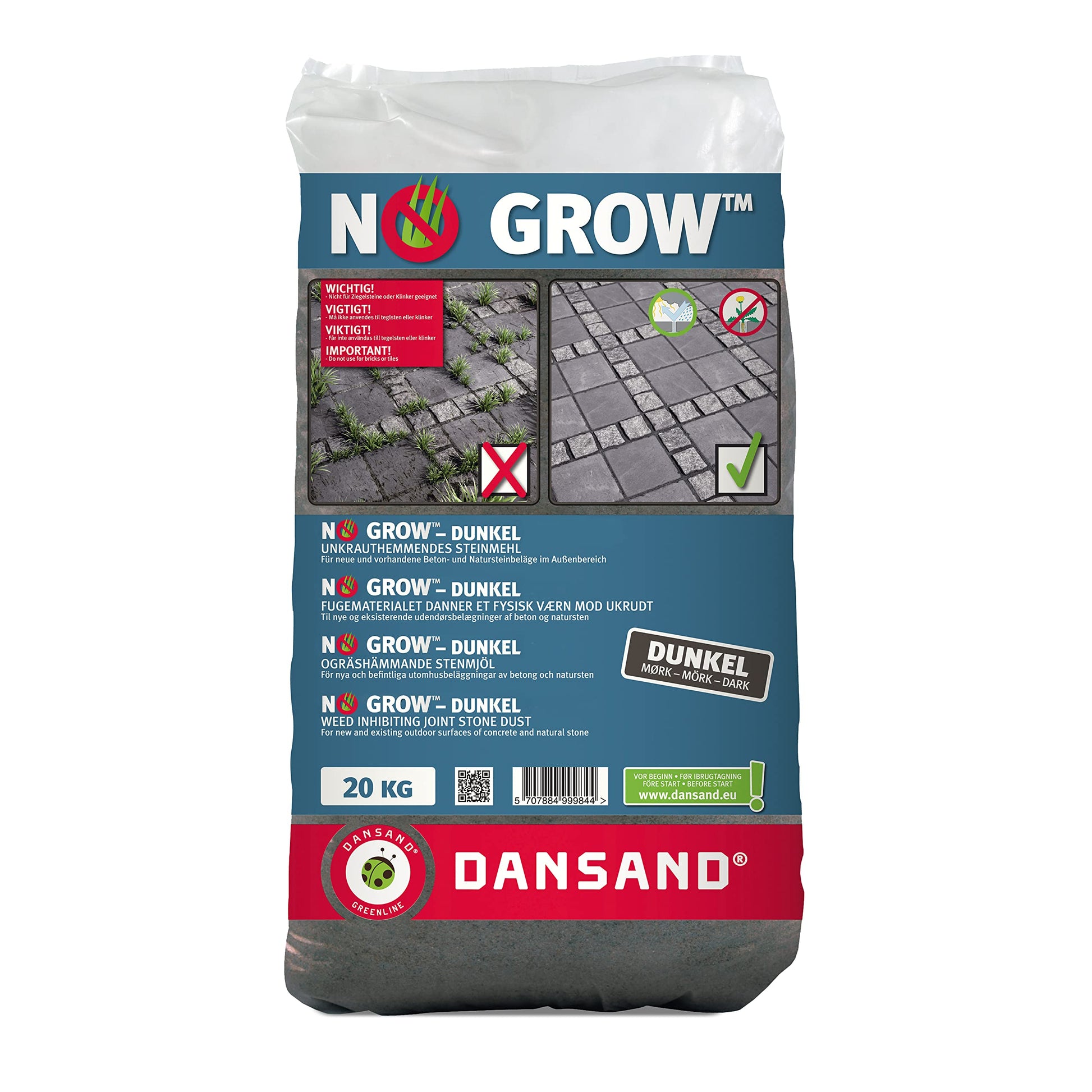 - PRODUCT SPECIFICATION - 20kg bag of Dansand no grow joint filling sand. Resists weeds and erosion. Suitable for all paving types. Available in Beige and Grey.