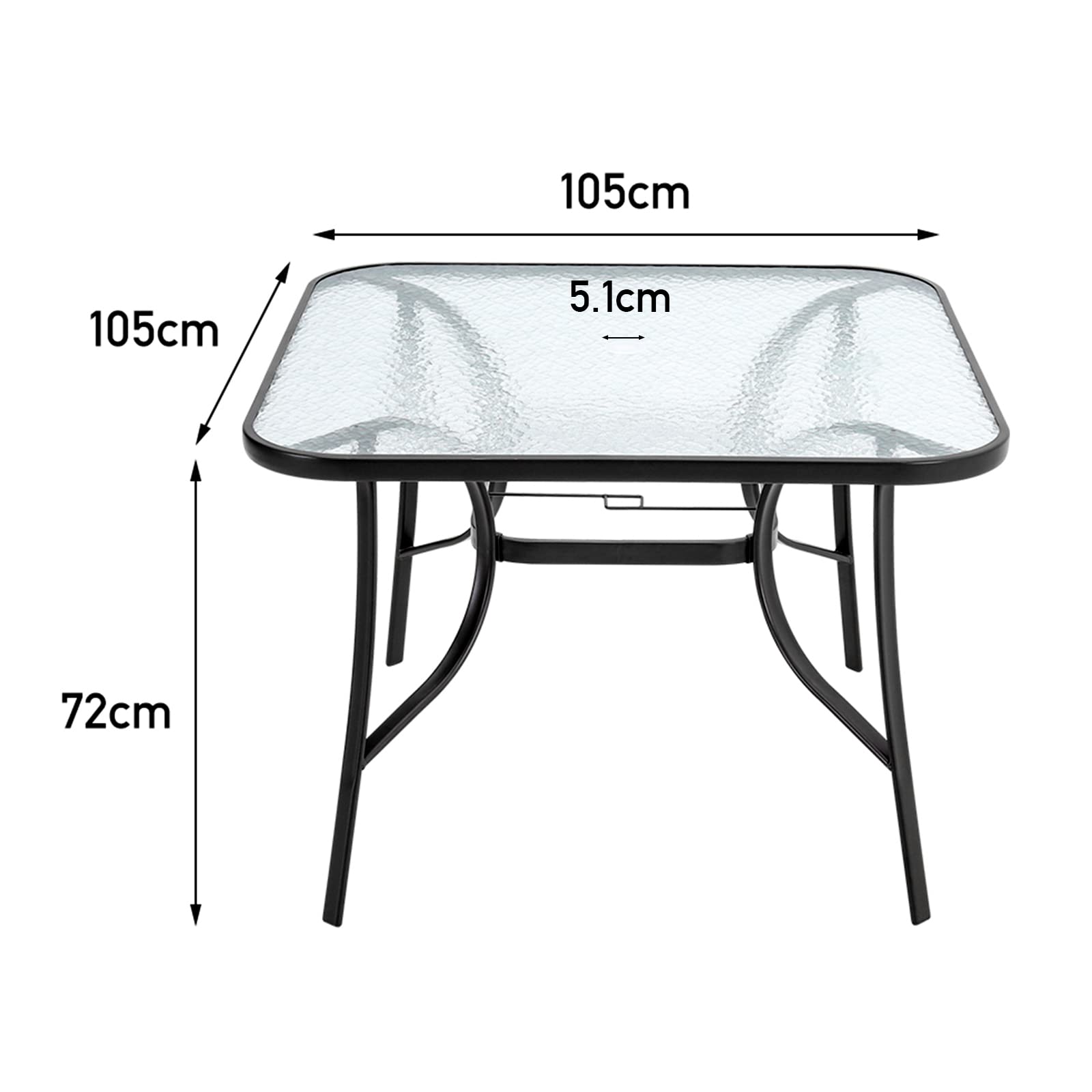 DKIEI 105cm Square Black Outdoor Table with Umbrella Hole, Modern Glass Top for Garden, Patio, Balcony, Backyard