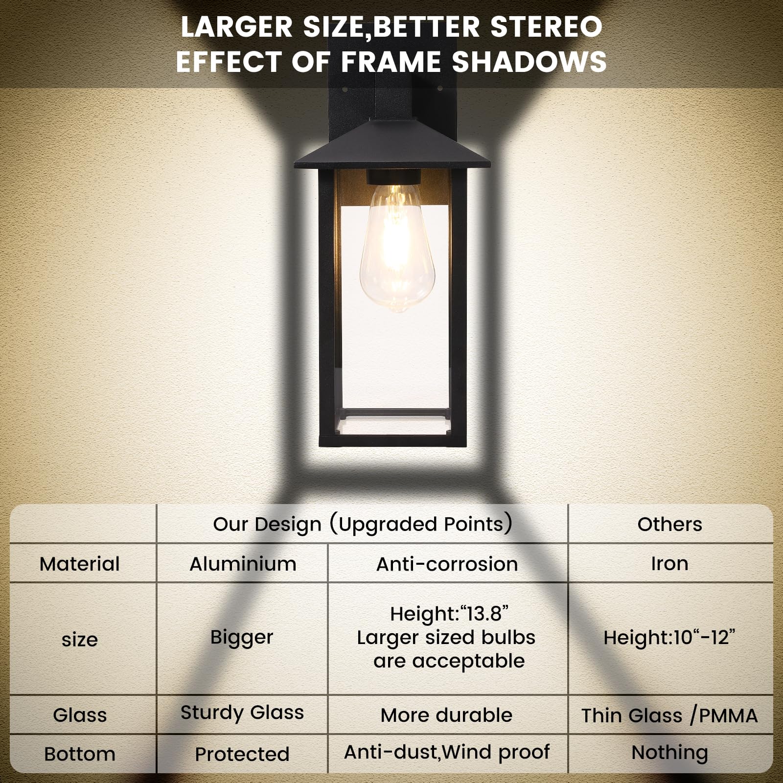 - Classic design & Practicality: The outdoor light fixture has matte black surface, high transparency clear glass. While adding a sense of modernity and elegance to your home, ensure sufficient light to illuminate your house.