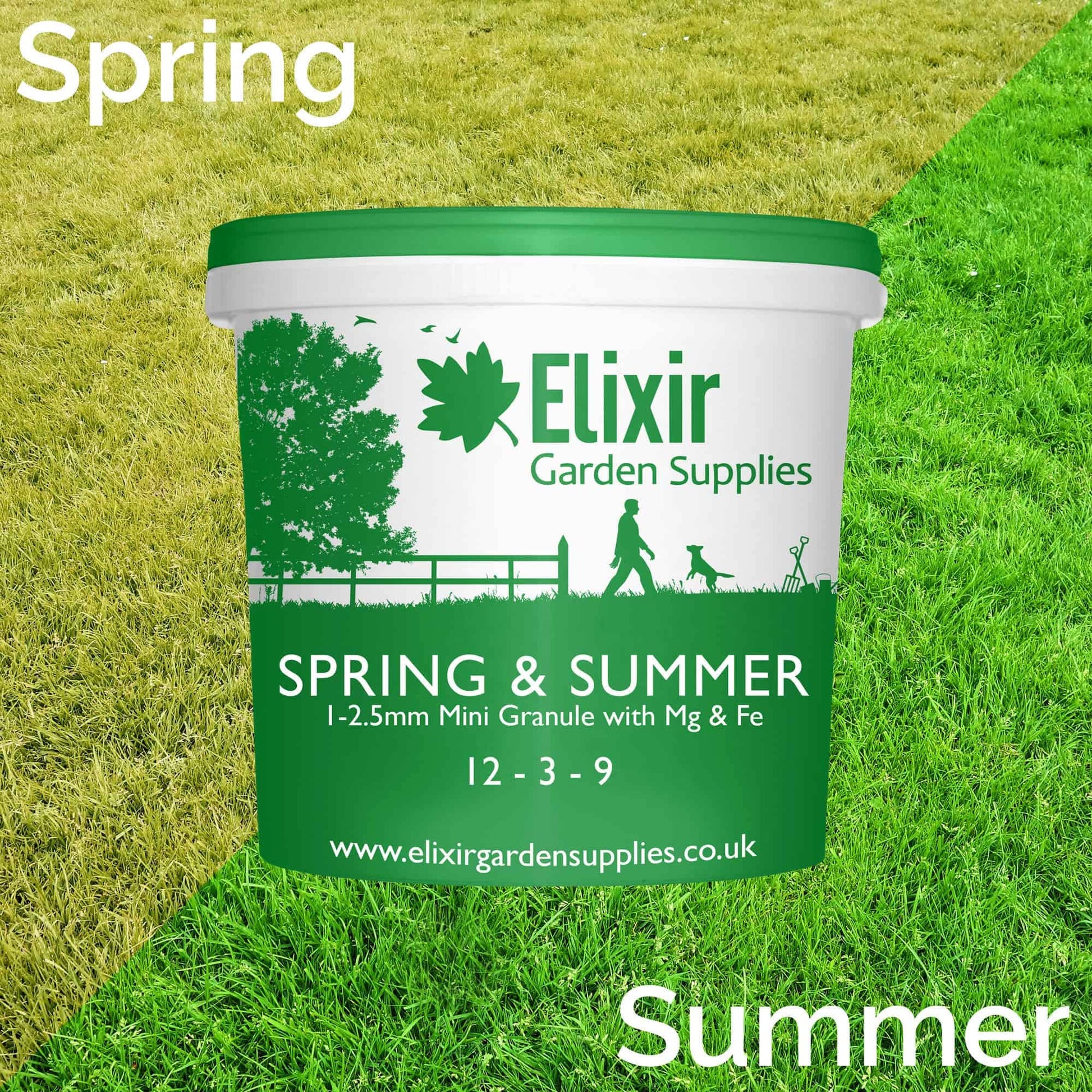 Elixir Gardens UK Spring & Summer Lawn Food/Feed & Granular Compound Turf Fertiliser with added Iron - Magnesium | 1kg-25kg Weights | NPK:12-3-9 - 2% Fe & 2% MgO | 5kg Tub Treats 200m²