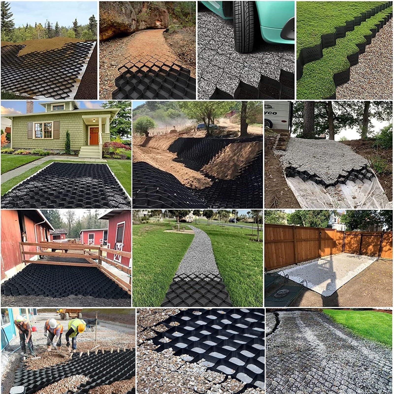 - Wide Range of Applications: Geo Grid Stabilization are ideal for installation on slopes and/or flat areas and are widely used in landscaping, patios, walkways, parking lots, lawn parking pad and farmhouses Horse farm, dense foot traffic grounds and foundations grid, and are very easy to install