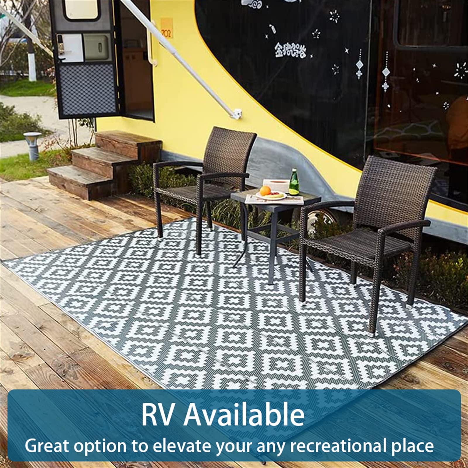 - ANTI-SLIP & SAFE Features nylon corner loops at corners for stakes (not included), our RV patio rug can better ensure your safety and reduce slippery accidents. Thicker but breathable material offers you a cozy feeling and allows the grass underneath to stay burden-free. Up to the high standard for using in the kids rooms, playrooms, and nurseries.
