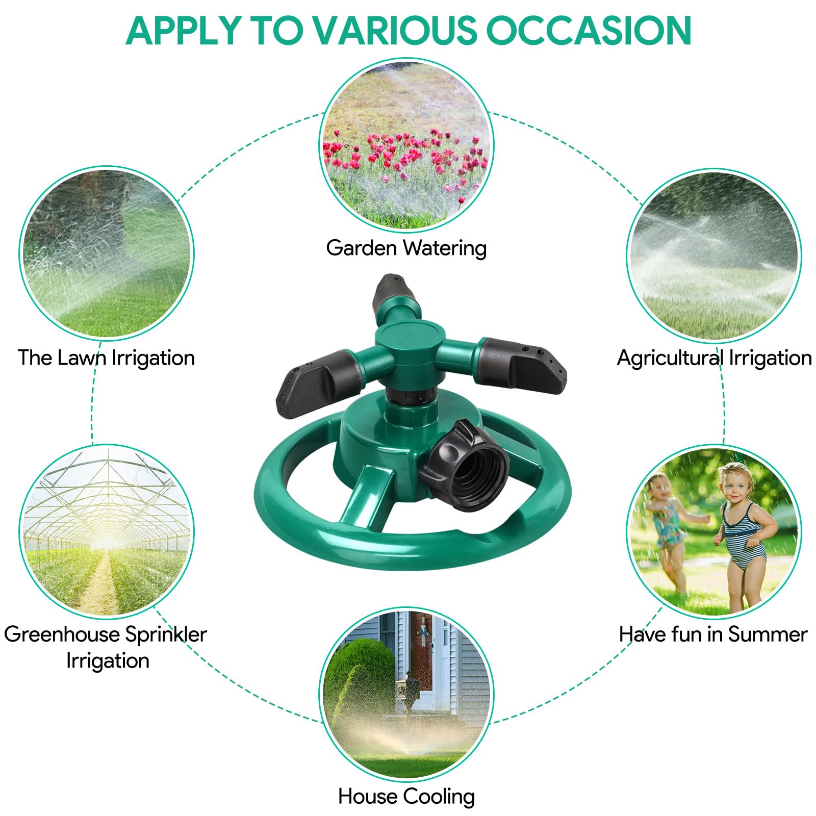 - Widely Use: Not only use on the lawn irrigation, but also house cooling in summer, Agricultural irrigation, Garden Bonsai,irrigation. If the garden or field is too big,you can connect several garden lawn sprinkler to expand the scope of irrigation, and also solve the problem of watering the plants and vegetables automatically.