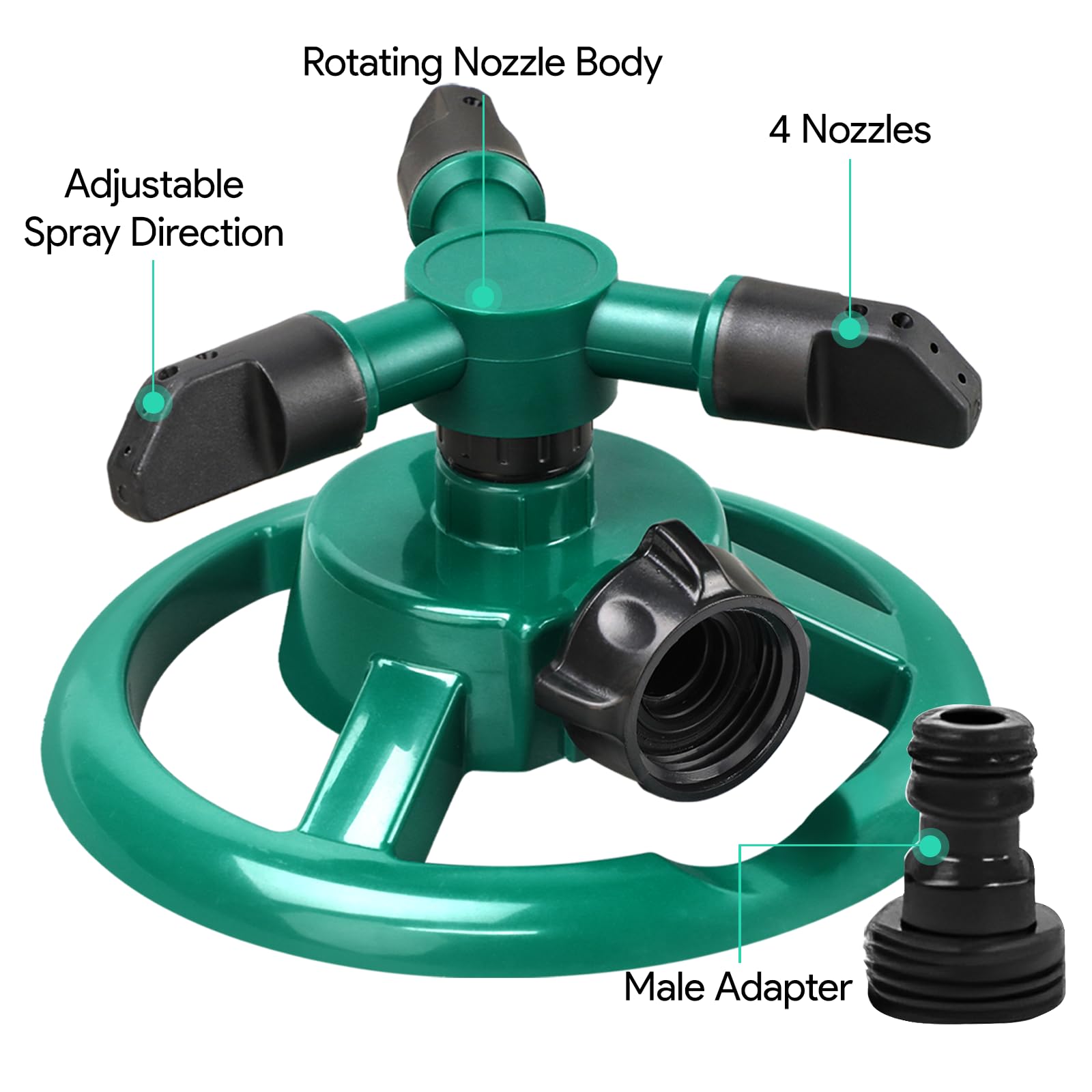 - Effective Water Sprinkler System: Spraying diameter is about 2-10 M. The lawn sprinkler for garden comes with 3 Arms,12 Built-in Spray Nozzles and made of high-quality ABS plastic, having automatic 360 degree rotation function. Ensure the water is clean without sand impurities to avoid stopping rotate.