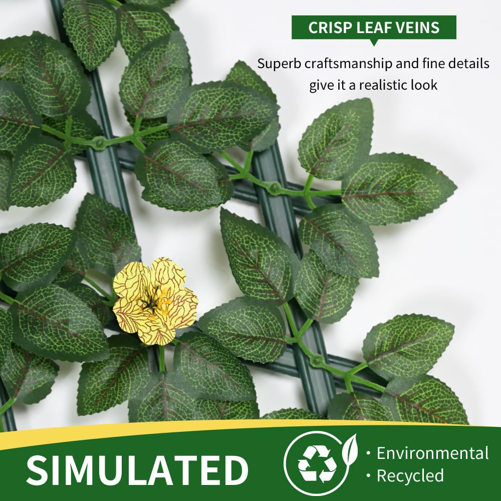 - Materials: The fence is made from plastic frame with decorative faux ivy leaves and flowers attached, provides a natural look, no maintenance, no watering, no trimming, easy to clean with water.