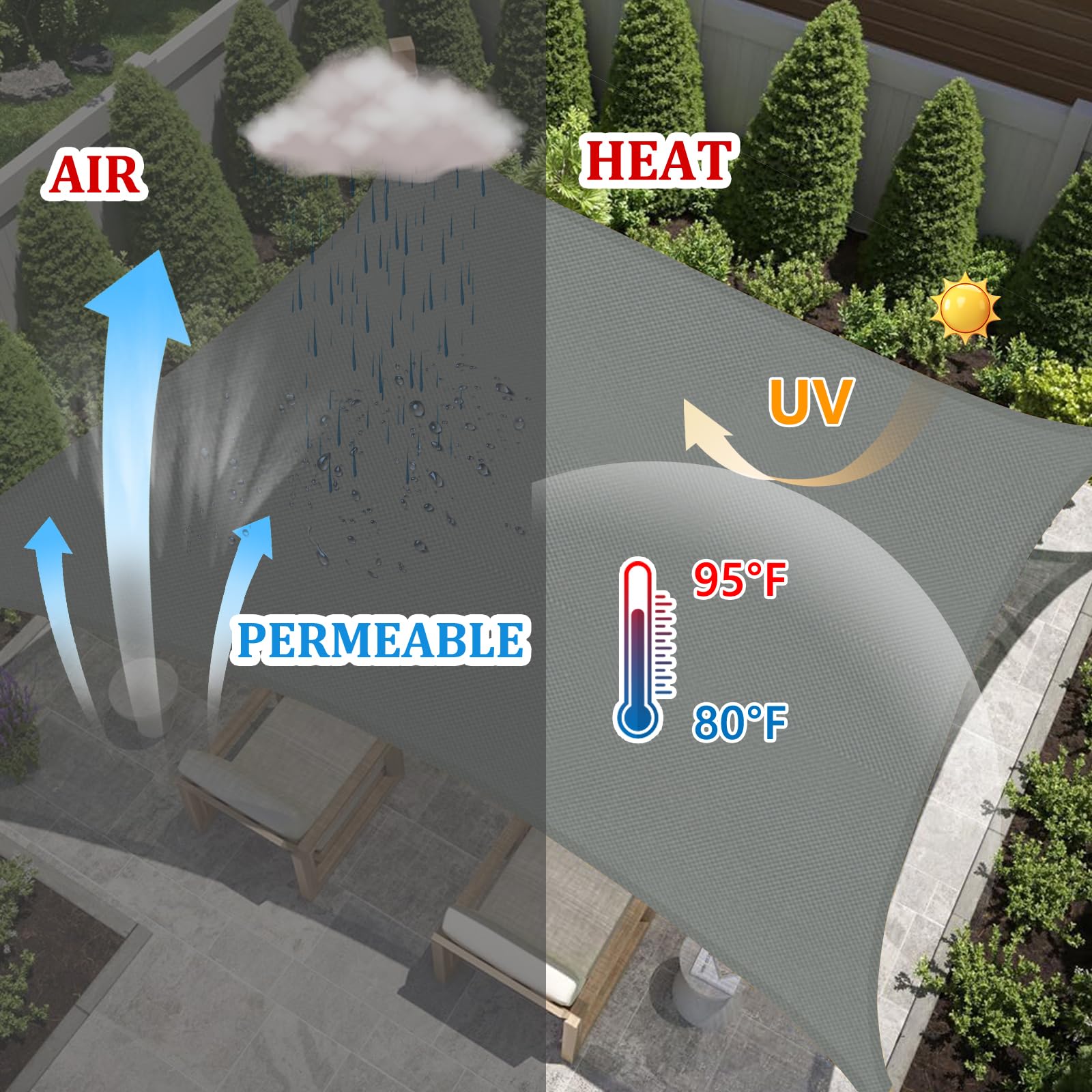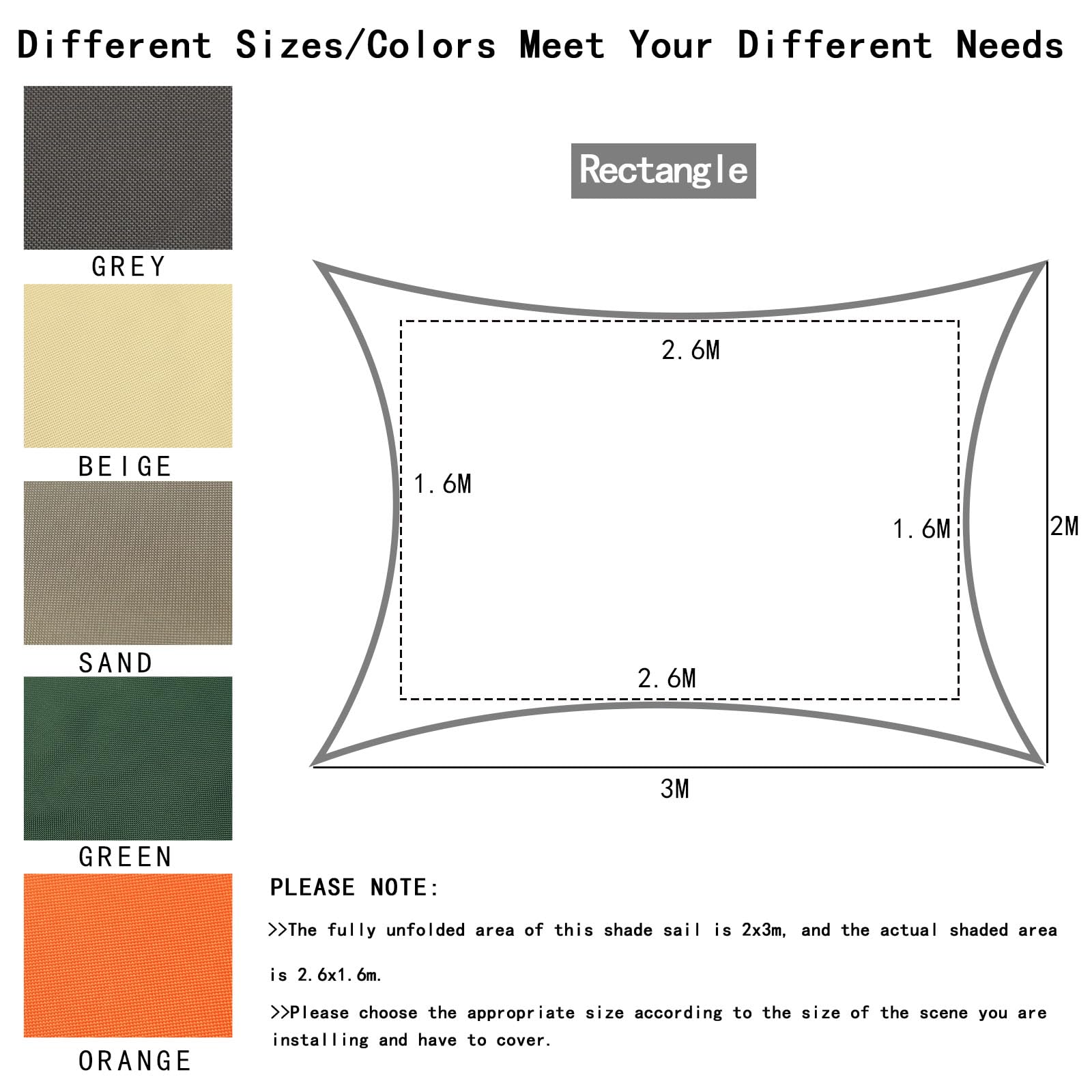 - 【Waterproof Outdoor Shade Sail】The Outdoor Sun Shade Sail is made of high quality waterproof 420D Polyester,this function can make canopy blocks rainwater on rainy days.But we do not recommend using the shade sail in stormy or snowy weather, because the bad weather like heavy rain may cause slight water seepage