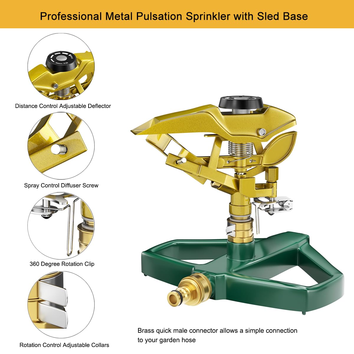 - STURDY METAL BASE - Durable metal rust-proof construction sled prevents it from tipping over or moving around while in use. Just by the pressure of household water supply to achieve automatic garden irrigation without other auxiliary power equipment.