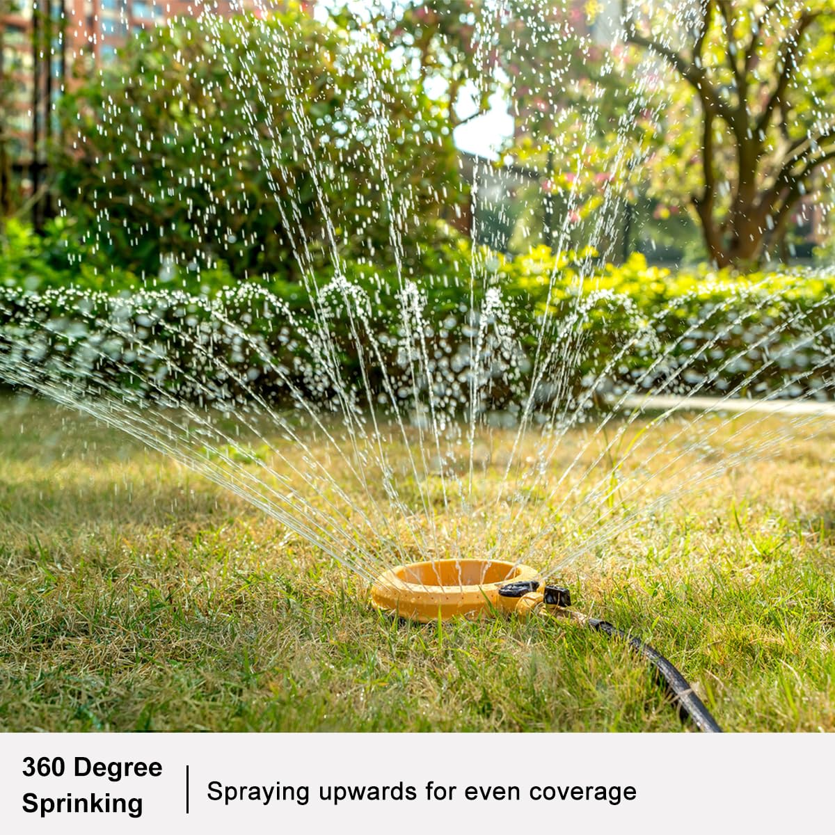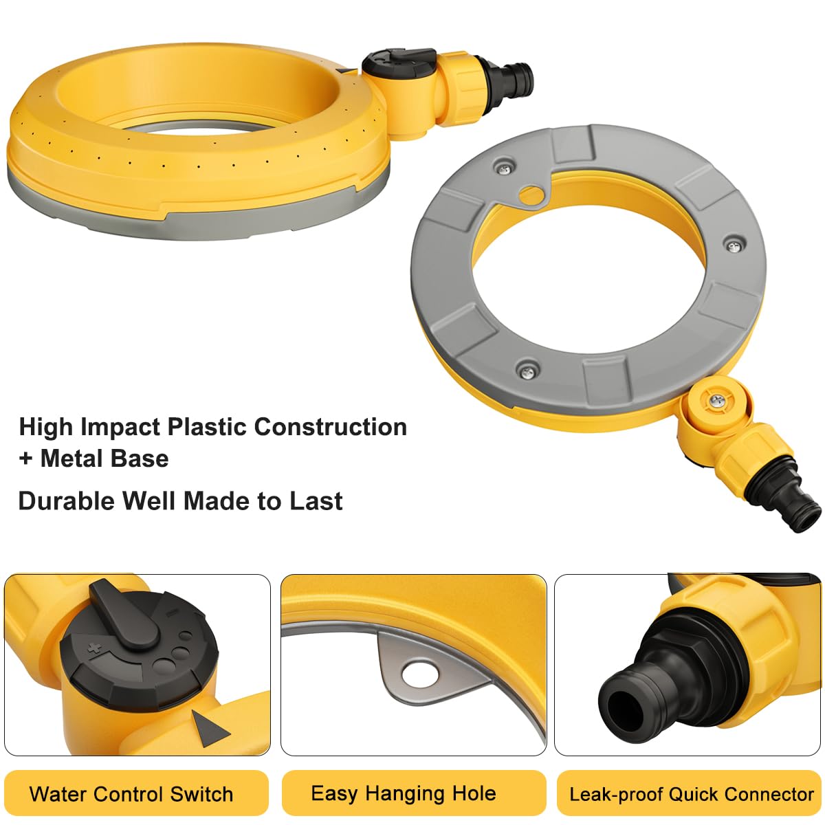 - RING SHAPED SPRINKLER DESIGN: The lawn sprinkler with circular design enables 360 degree spraying without leaks. Even spray, water-saving design, easy to use, ideal for regular watering of lawn and garden areas, a good helper for your gardening. Spray reaches a 36 ft diameter, 8 ft height and 1000 square ft coverage.