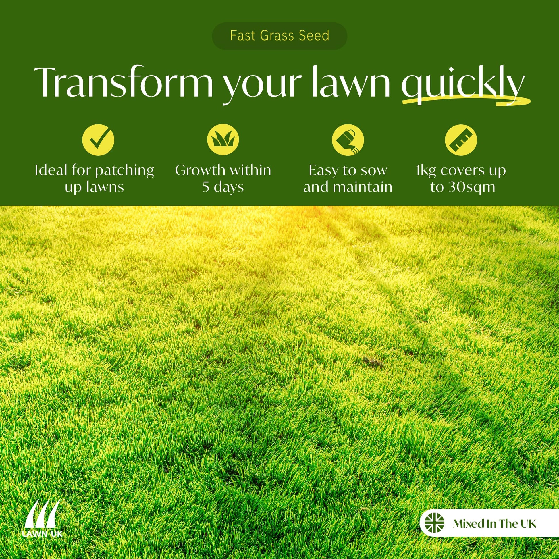 - SPEEDY RESULT: Our Fast Grass Lawn Seed germinates as quickly as 5-7 days in the right sowing conditions. Transform your lawns with amazing results when using our grass seed mixture. Perfect for lawns in the UK.