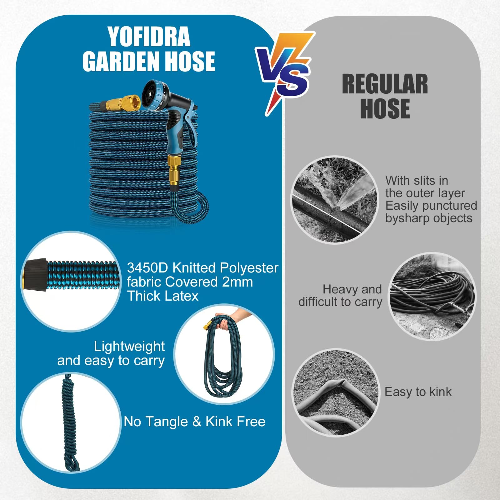 - ★High quality - The garden hose is made of high-density double-layer latex core and super strong fabric, without tangles, which can prevent leakage and rupture. The hose is compact, ultra light, and extendable, suitable for everyone to use.