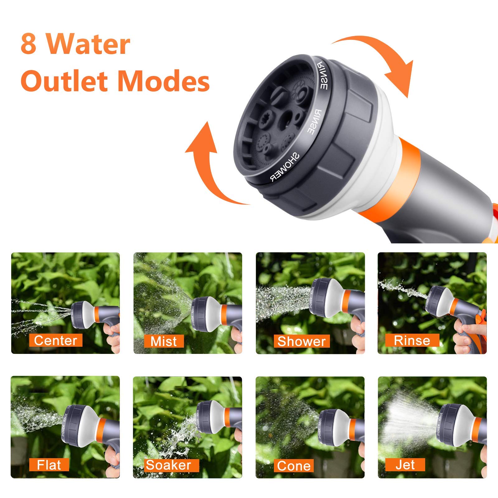 - 🌞【 8 adjustable Watering patterns】Hose Pipe Spray Gun has 8 kinds of watering settings (Centre, Mist, Shower, Rinse, Flat, Soaker, Cone, and Jet) to meet all your watering needs. From high pressure (clean a hard dirty surface) to the soft level(wash your pets), Used for Watering Plants, Cleaning Your Windows, Washing Out Your Guttering, Filling Up your Pond, Car Washing, Pet Shower (Adjustable Outflow From Top of Hose To Keep Your Pets Safe), Sidewalk Cleaning & Much More!
